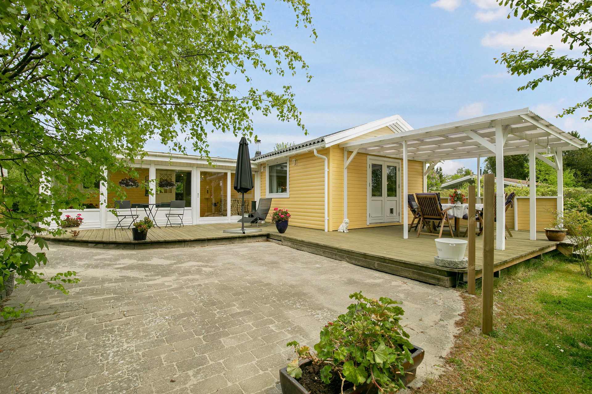 Særdeles charmerende fritidsbolig på 90 m2, som fremtræder med gule træfacader og hvide vinduesrammer. Fritidsboligen ligger med stor terrasse i sydvestvendt retning, hvorfra haven og udelivet kan nydes dagen igennem - oplagt til skønne grillaftener og et glas rose. En del af terrassen er tillige overdækket så den stadig kan bruges om aftenen. Desuden en stor skøn udestue til at forlænge hele sæsonen – huset er blevet brugt som helårsbolig, og er med både brændeovn og varmepumpe klar til brug hele året.