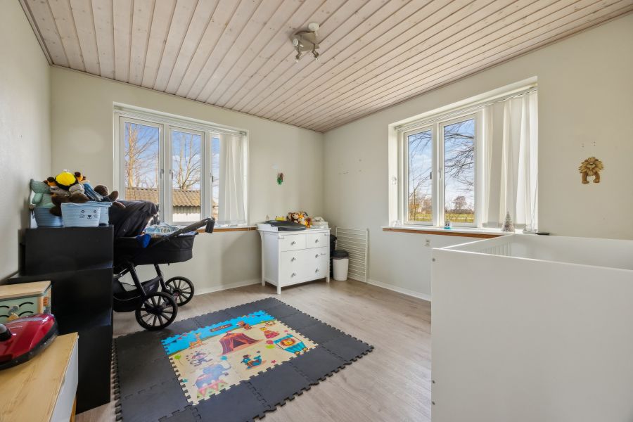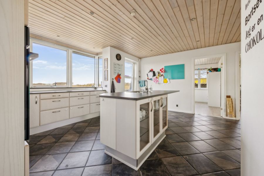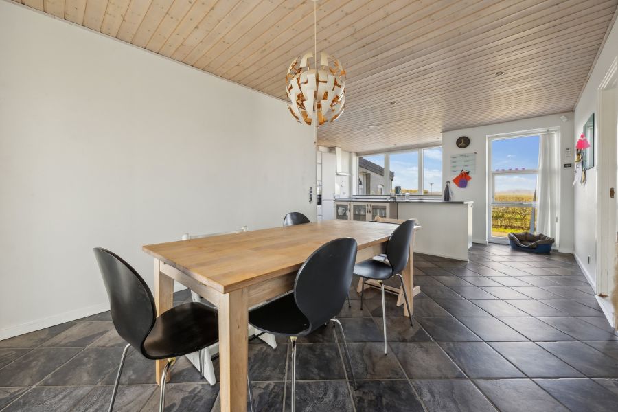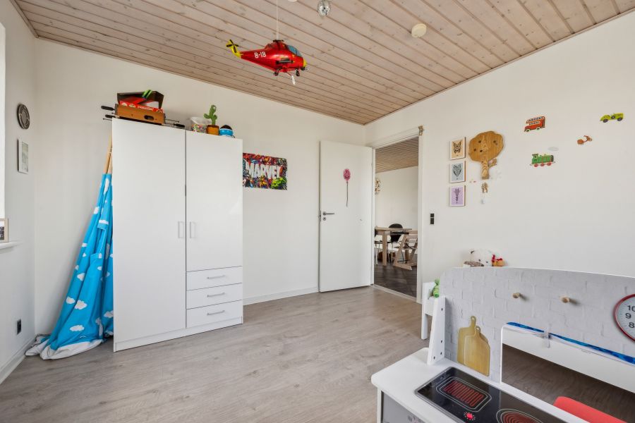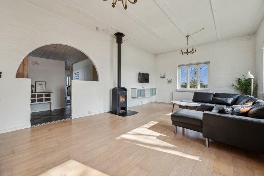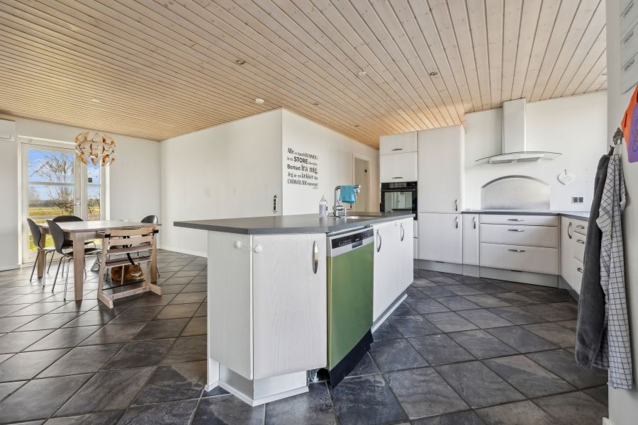 Et lyst indre og rummelige fællesarealer er, hvad der beskriver hjemmets 148 kvadratmeter bedst. Planløsningen råder over tre soveværelser, der kan indrettes som børneværelser, et hobbyrum eller et hjemmekontor, en stor stue, hvor brændeovnen også bidrager til den hyggelige stemning, et praktisk viktualierum, et fyrrum og et fint badeværelse. Endelig er der det skønne køkken-alrum, som indbyder til samvær og nærvær. Køkkenet står i et lyst design, og den gavmilde mængde af både bord- og skuffeplads giver de bedste forudsætninger for at gå på opdagelse i alverdens spændende opskrifter. Skal børnene have hjælp med lektierne henne ved spisebordet, kan du stadig holde overblikket over køkkengryderne takket være den åbne planløsning.