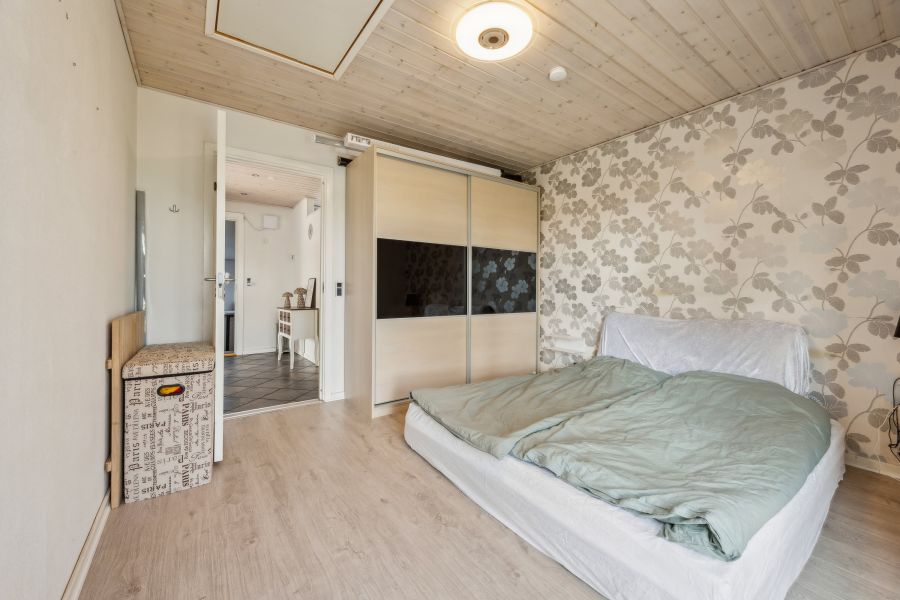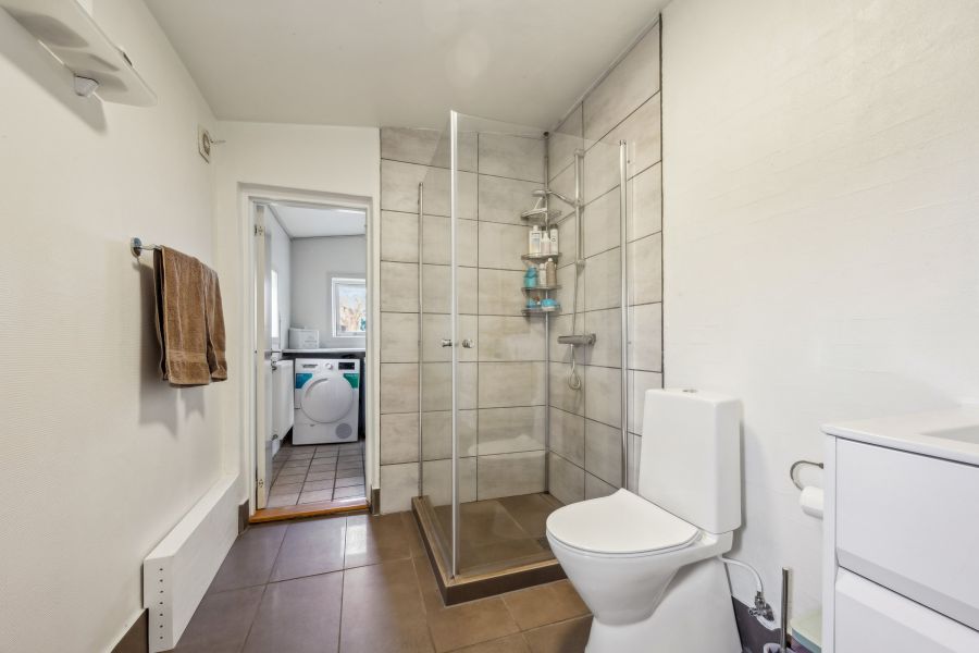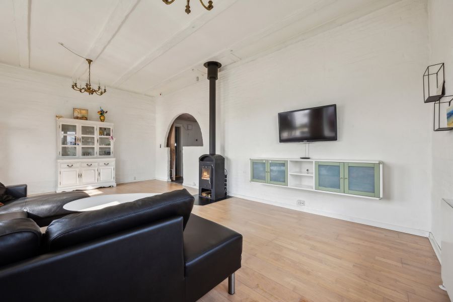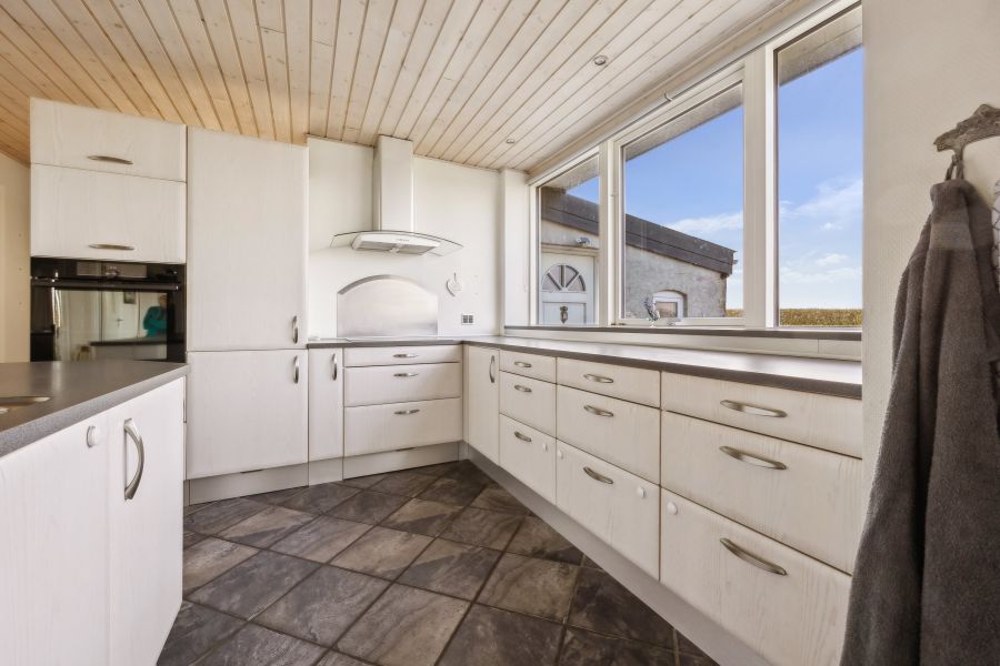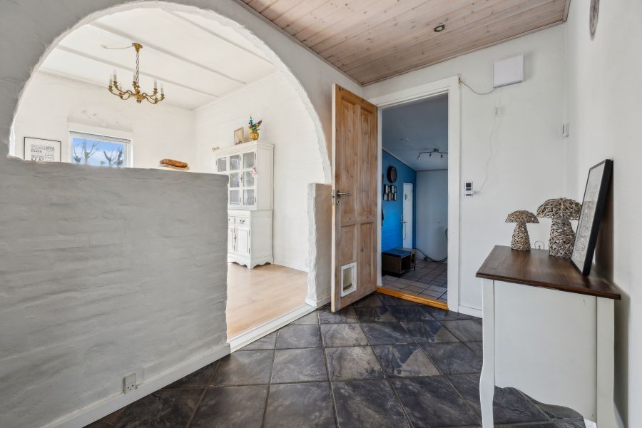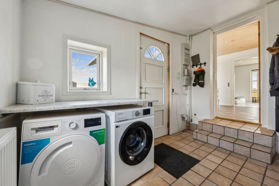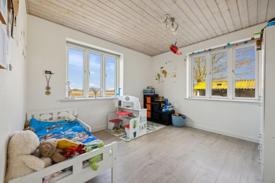 Et lyst indre og rummelige fællesarealer er, hvad der beskriver hjemmets 148 kvadratmeter bedst. Planløsningen råder over tre soveværelser, der kan indrettes som børneværelser, et hobbyrum eller et hjemmekontor, en stor stue, hvor brændeovnen også bidrager til den hyggelige stemning, et praktisk viktualierum, et fyrrum og et fint badeværelse. Endelig er der det skønne køkken-alrum, som indbyder til samvær og nærvær. Køkkenet står i et lyst design, og den gavmilde mængde af både bord- og skuffeplads giver de bedste forudsætninger for at gå på opdagelse i alverdens spændende opskrifter. Skal børnene have hjælp med lektierne henne ved spisebordet, kan du stadig holde overblikket over køkkengryderne takket være den åbne planløsning.
