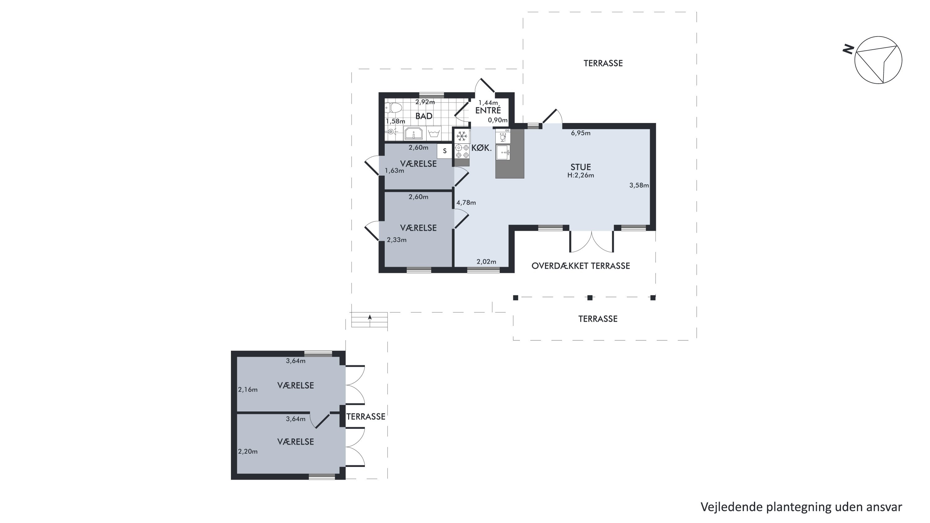 Alt fremstår utrolig velholdt, så I kan straks pakke taskerne ud og lade feriestemningen brede sig. Lyst og hvidmalet træværk pryder gulve, vægge og lofter, hvilket skaber en rar og luftig atmosfære, som følger jer fra entréen til de to værelser og videre ind i det åbne opholdsrum, hvor det fine køkken ligger ud i ét med stuen. Dertil kommer et moderniseret badeværelse med brus, væghængt toilet og rene linjer i indretningen.
