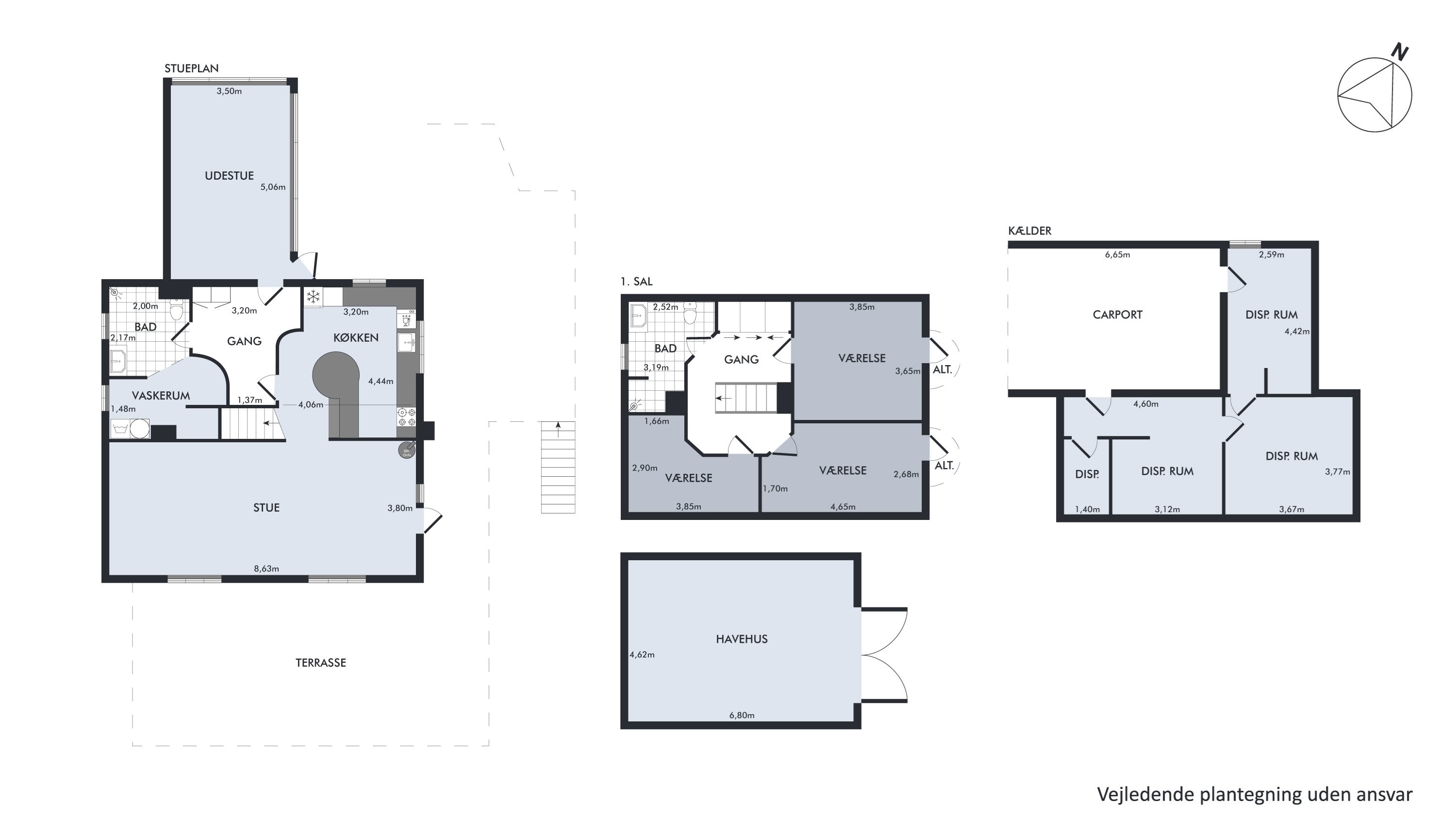 Derudover har boligens stue udgang til terrasserne, der orienterer sig mod både syd, øst og nord. På den måde kan I dagligt veksle mellem solvarme omgivelser og den svale skygge, mens I tager de smukke omgivelser ind. Udesæsonen forlænges desuden af en god udestue, og matriklen rummer yderligere et havehus.