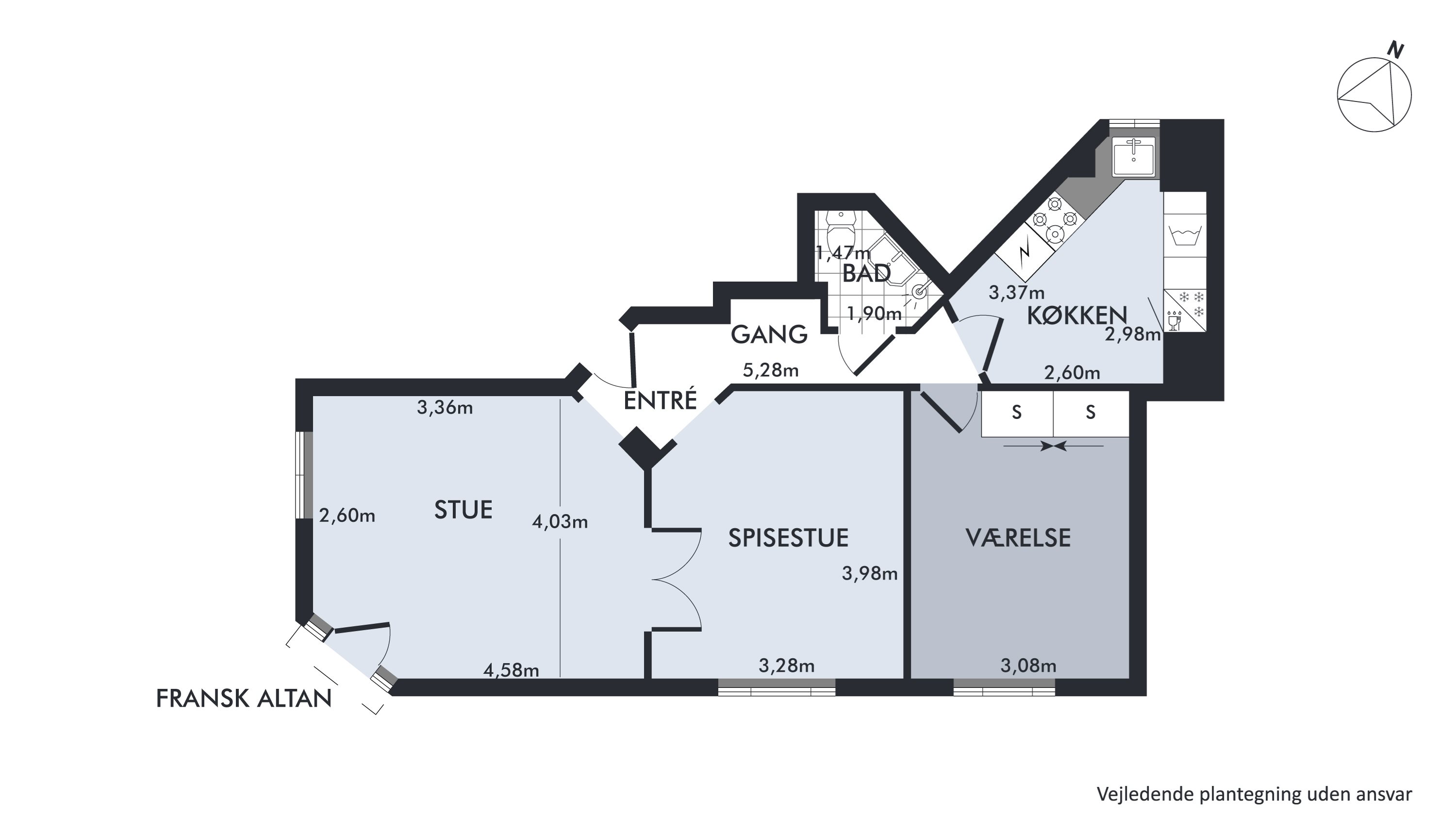 På en sidegade til Godthåbsvej ligger Bentzonsvej, og det er lige præcis her, I får hjemme. Lejligheden breder sig over 79 veldisponerede kvadratmeter, og den gode planløsning sørger for, at der er plads til, at parret eller den lille børnefamilie flytter ind. Samtidig er beliggenheden utrolig attraktiv, da I bosætter jer i Svømmehalskvarteret med den nyrenoverede Frederiksberg Svømmehal bare 300 meter fra adressen.