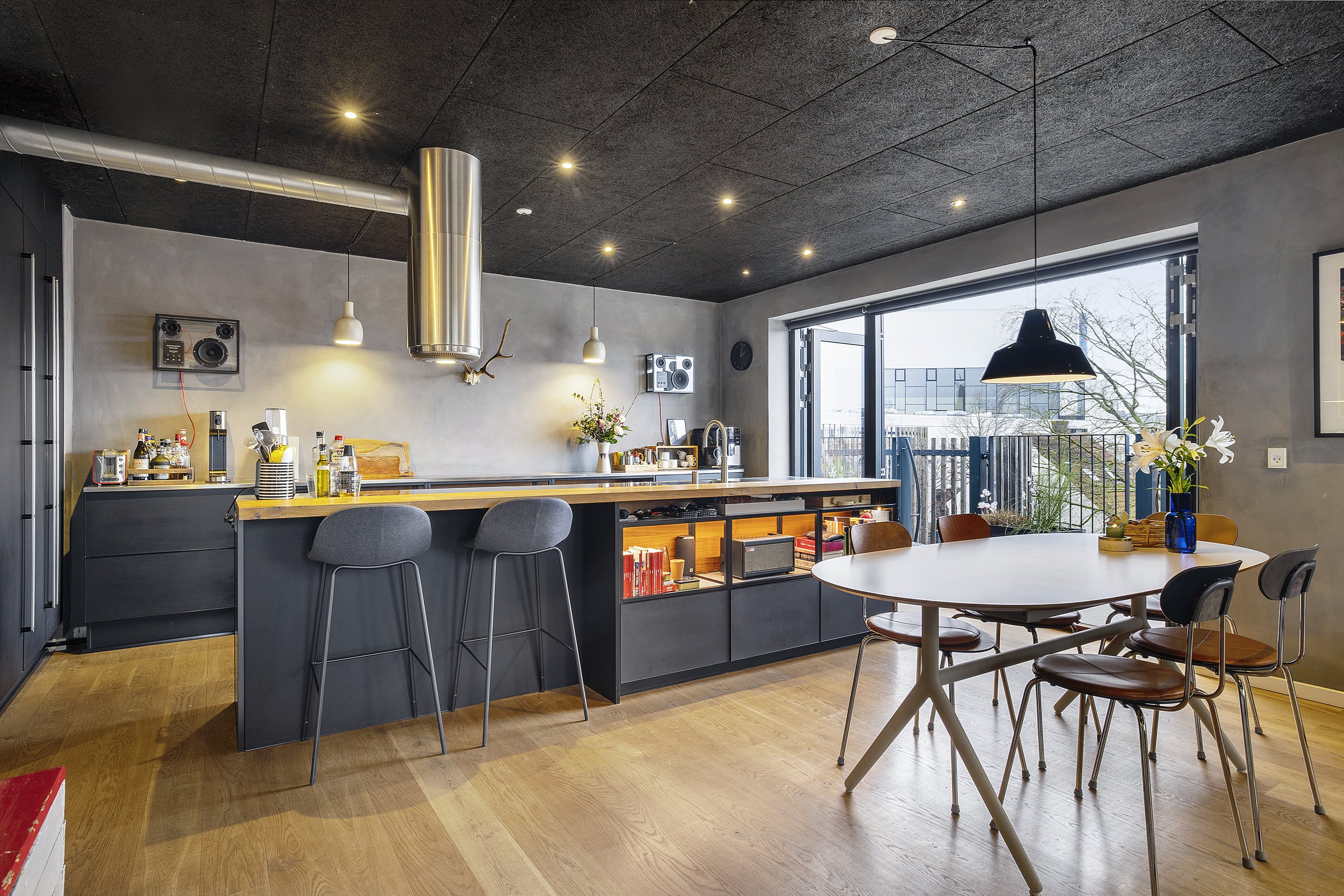 Den topmoderne ejendom stod færdig i 2018, og den danner ramme om i alt ti lejligheder - ni af dem er separate lejligheder, og den tiende er en stor fælleslejlighed på 115 kvm med stort køkken, spiseplads, badeværelser, soveværelser og tv-stue, som alle ni boliger har andel i. Alle lejlighederne er unikke og boligen, som nu kan blive jeres, er der ikke sparet på noget som helst. Boligen strækker sig over en veldisponeret planløsning, hvor der både er plads til samvær og privatliv. Lejligheden har en god placering på øverste etage, og der er selvfølgelig elevator i opgangen. Hoveddøren byder indenfor til et gennemført hjem med flotte gulve, vægge og akustiklofter samt strømlinet interiør, og derudover inviterer de store vinduespartier lysindfald og super udsigt. Planløsningen fordeler sig over en entré, et gæstetoilet, et badeværelse med afsæt til et walk-in-closet, tre møblerbare værelser, en hyggelig, vestvendt stue samt et fantastisk køkken-alrum med videre afsæt til et kontor/musikrum, som på flotteste vis er afskærmet af en new yorker-glasvæg. Prikken over i’et er uden tvivl den store altan, som strækker sig hele vejen langs lejlighedens facade i øst - i sommermånederne vil I uden tvivl sætte pris på at kunne åbne op og på den måde få en glidende overgang mellem inde- og udearealer.