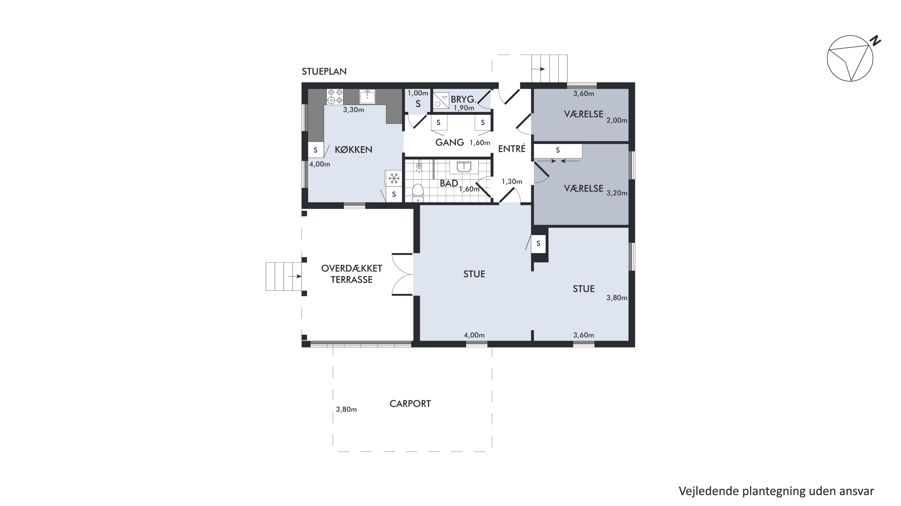 De gule sten er fint udsmykket med røde detaljer, og fortil får I plads til en, to, tre, måske fire biler, skulle I have brug for det. Omme bagved venter ét af højdepunkterne, nemlig haven, der ligger solrigt og perfekt mod vest. Der er mest af alt bare græsplæne, så I skal ikke tænke særligt meget på havearbejde, men blot nyde solens stråler i dagens sene timer. Der er en overdækket terrasse, men måske I skal anlægge jer en lækker træterrasse, skaffe en trampolin eller et gyngestativ?