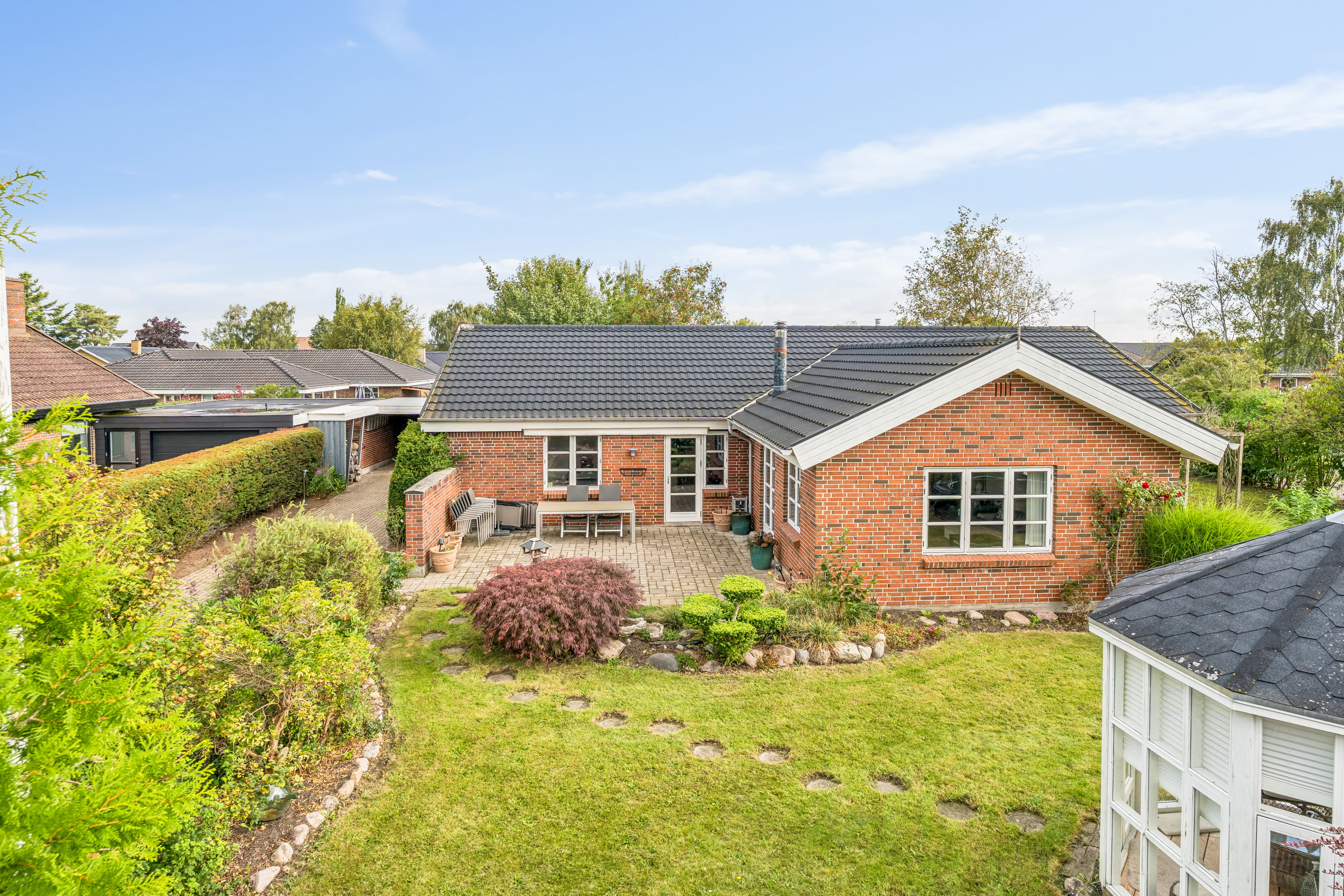 På den blinde vej ledes I via en indkørsel op til en carport og mod huset, hvor I kan træde indenfor gennem en entré og et bryggers med vaske-/tørrefaciliteter. Centralt i hjemmet åbner køkkenet sig op mod spisestuen, og denne fortsætter videre ind i en dagligstue. Begge steder er der udgang til den sydvestvendte terrasse, mens resten af boligens 171 m2 består af to badeværelser samt fire værelser, der kan indrettes til store og små.