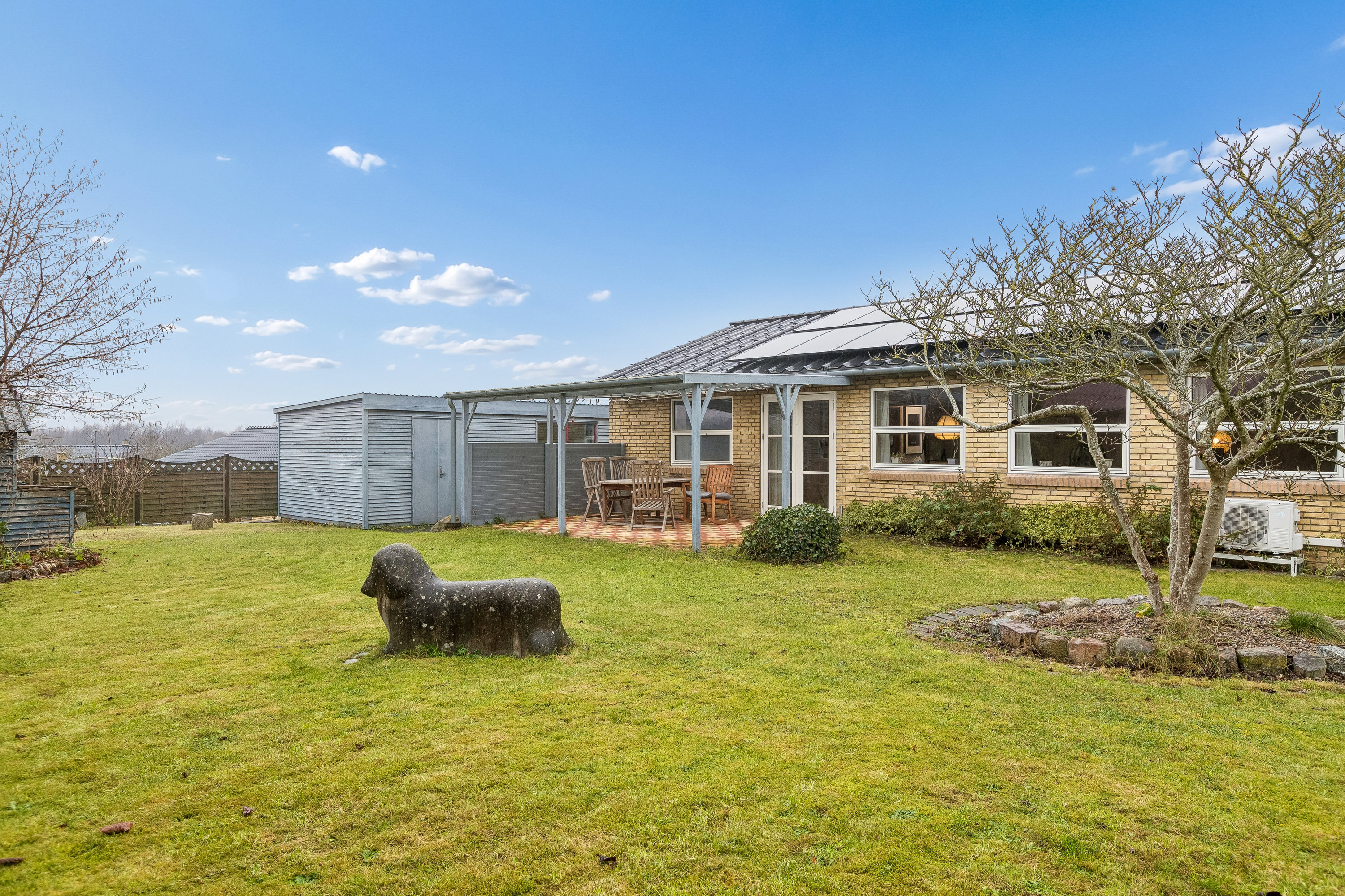 I ankommer til et roligt villakvarter, hvor gulstensvillaen tager imod jer med en god indkørsel, der viser vej ind i carporten. Haven folder sig nydeligt og velanlagt ud direkte mod solrige syd, og græsset indbyder til leg og solbadning på afslappede sommerdage. Den overdækkede terrasse danner en naturlig udendørs spiseplads, hvor middage og grillaftener kan nydes i det meste slags vejr. Som et ekstra plus får I et stort og mulighedsrigt udhus, der gør sig perfekt som værksted, skur eller måske hobbyrum.