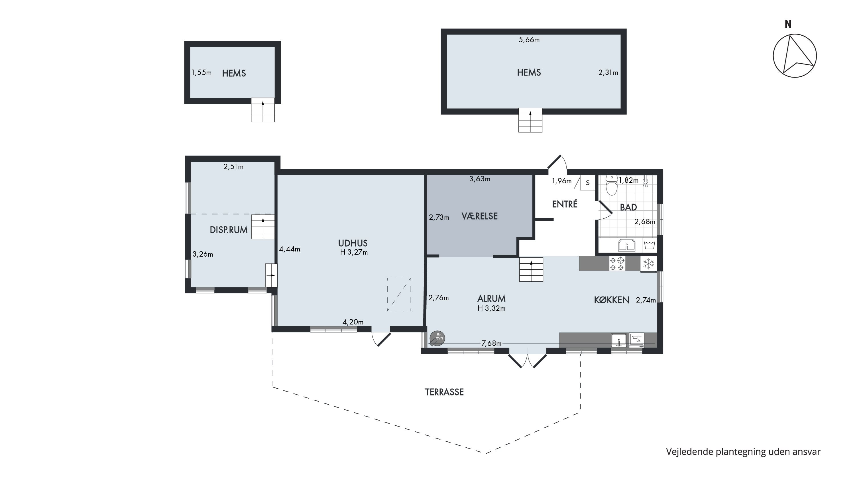 Indendøre går turen gennem lyse, indbydende rammer, hvor det er nemt at føle sig hjemme. Hovedhus med massivt trægulv og stort køkken alrum og badeværelse med gulvvarme og vaske/tørretumbler. Der er hems i hele hovedhusets længde med gode bonus kvadrameter. I forlængelse af hovedhuset findes et lyst udhus på 32 kvadratmeter, som er opført i 2017 og bygget i samme stil som hovedhuset.
