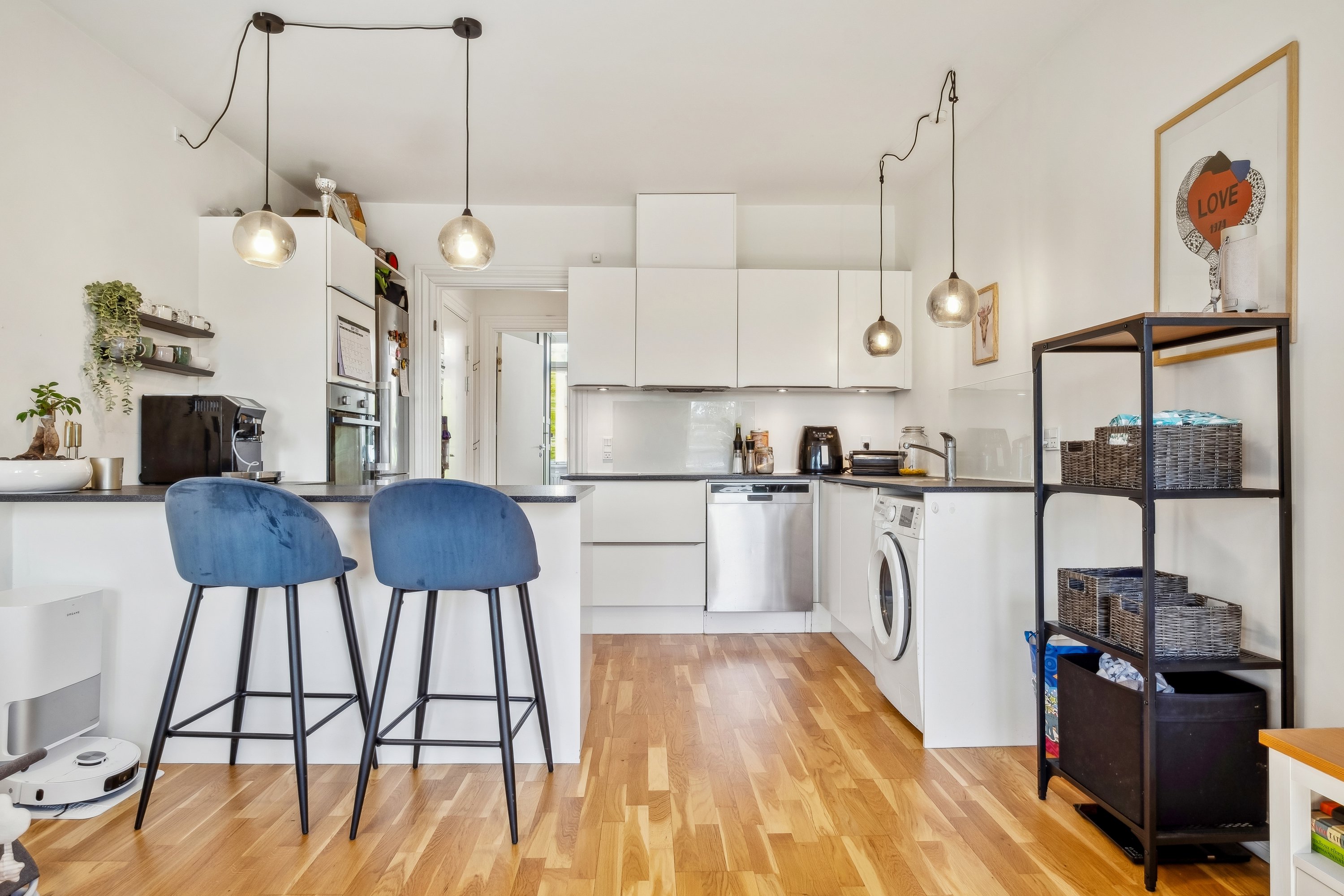 Det er oppe på anden sal, øverst under taget, at dit nye hjem venter. Her folder kvadratmeterne sig ud over en klassisk, toværelses planløsning med en fordelingsentré, der åbner videre op til samtlige rum. På den ene side har du et godt og indretningsvenligt værelse, ligefrem har du et veldrejet badeværelse med separat brus, og til sidst kan du finde dig til rette med et rummeligt og indbydende køkken-alrum. Her leder et lyst, moderne og veludstyret køkken dig naturligt videre ind i stuen, og med plads til et par barstole ved køkkenhalvøen kan du indrette en hyggelig spisekrog, så du stadig kan have den store flydersofa med.
