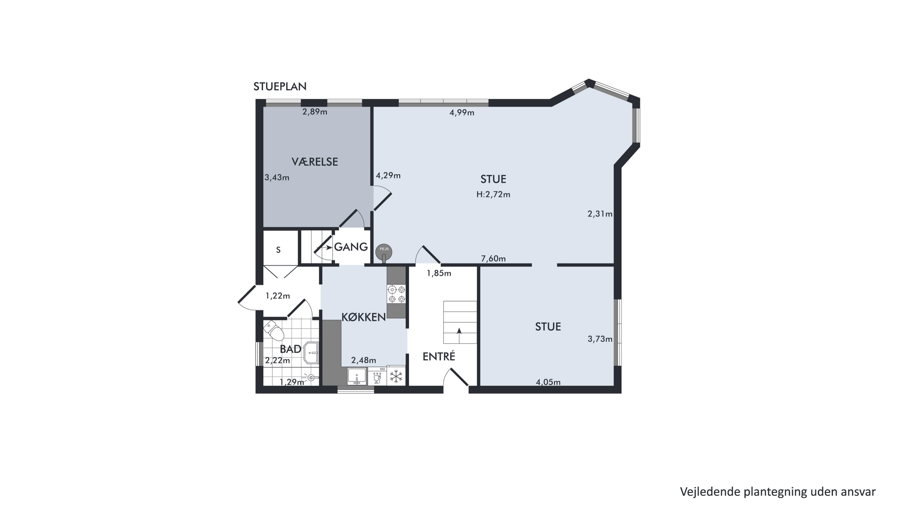 Stueplanet består af entré, badeværelse, endnu et værelse samt køkken og to stuer. I får altså i alt fem værelser at indrette jer på, så her er virkelig plads til den store børneflok eller til både gæsteværelse, hjemmekontor og krearum med f.eks sybord og garnkasser.