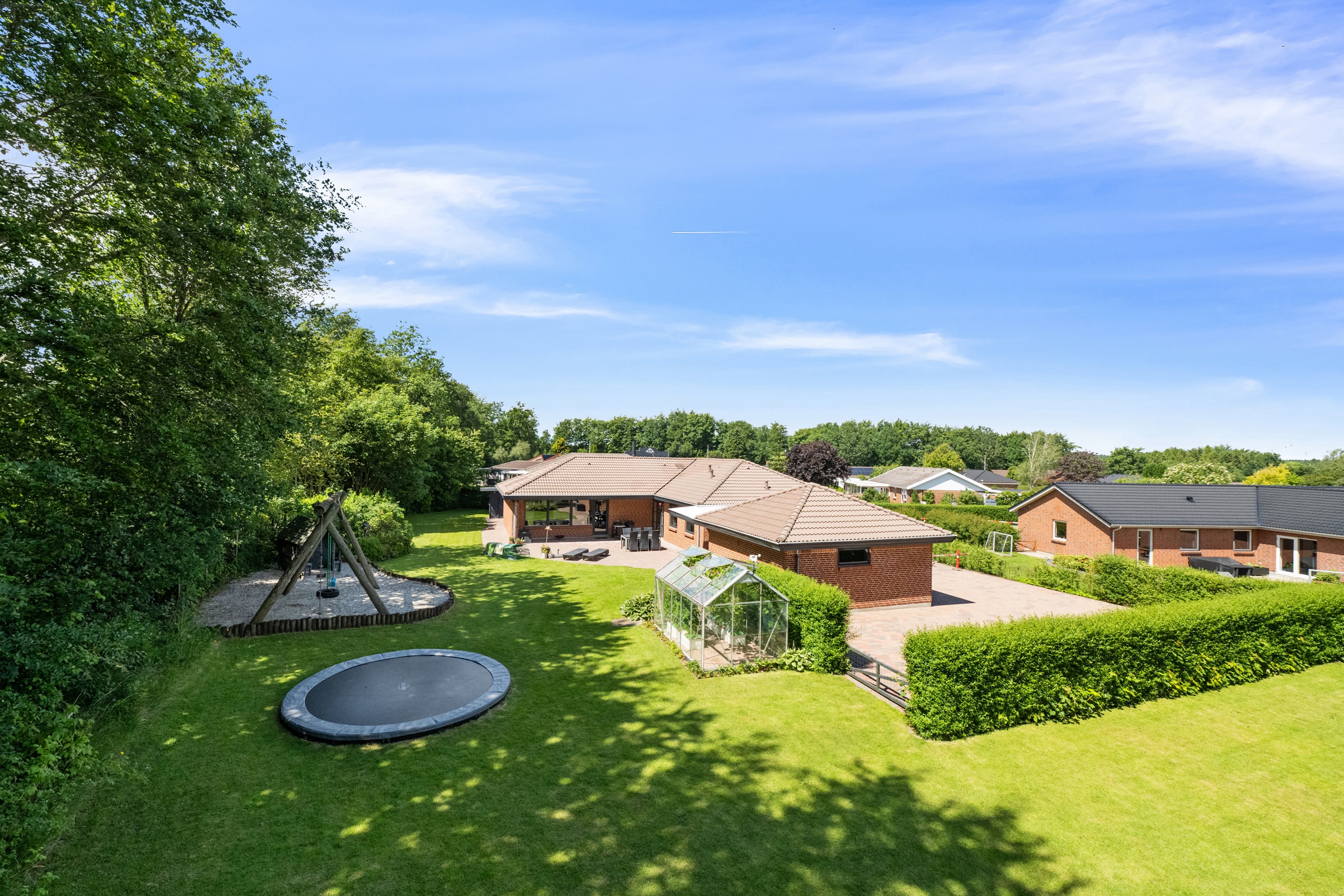 Villaen har slået rødder på en 1.455 kvadratmeter stor grund, og der er gode parkeringsmuligheder for jer og jeres gæster med den rummelige indkørsel. Der er desuden en garagebygning med værksted samt et redskabs- og brændeskur, mens den sydvendte terrasse sørger for solens bedste timer. Haven er et rent slaraffenland for børn og barnlige sjæle med plads til leg af enhver slags.