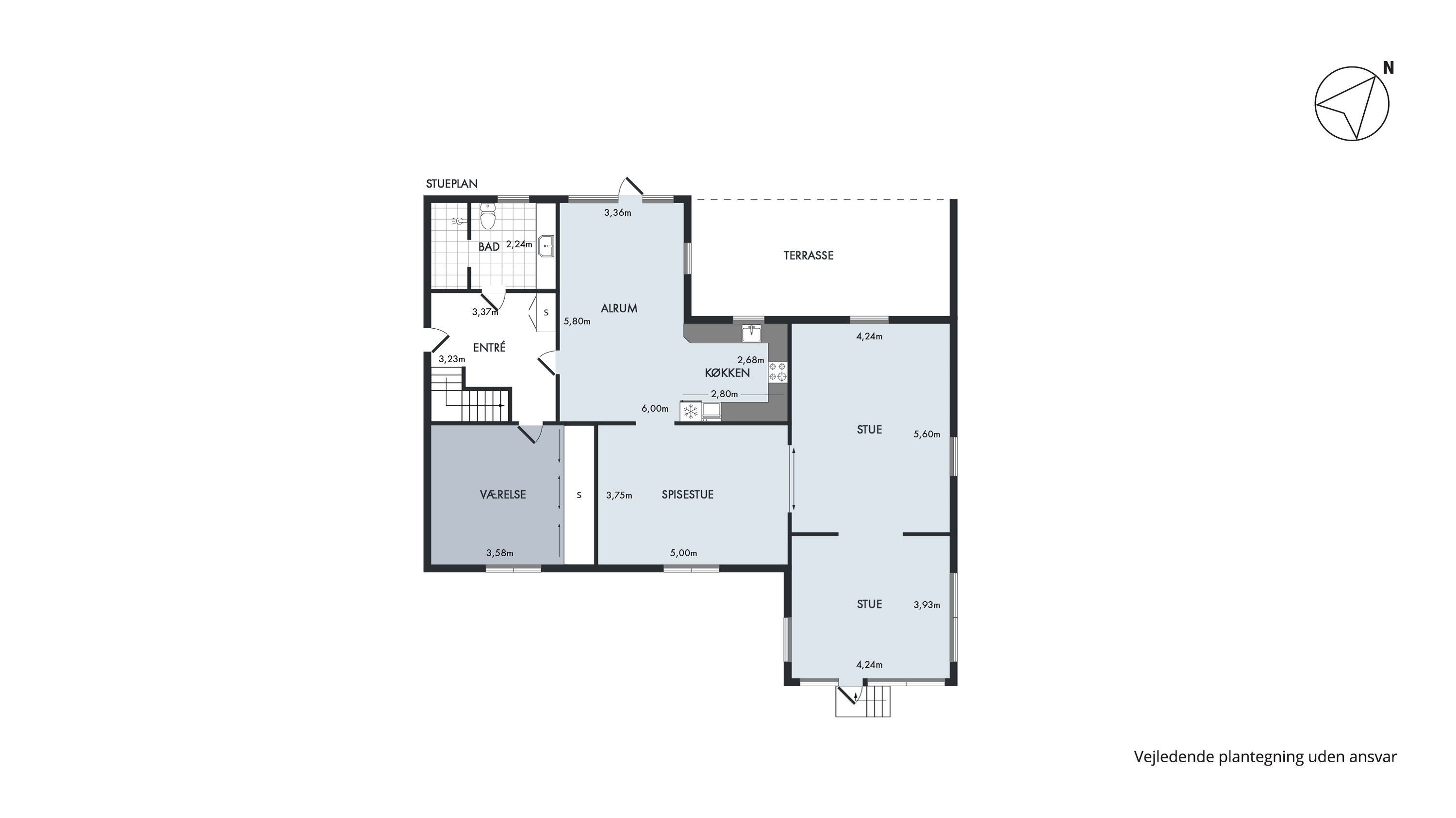 Stueplanet inviterer jer med indenfor til en entré, og i forbindelse heraf nås trappen til førstesalen samt badeværelset med separat bruseniche og toilet. Videre indenfor nås køkken-alrummet, hvor køkkenet er opført i sarte nuancer, der står flot til de lyse trælofter, mens der er rig spisebordsplads i alrummet. Desuden er alrummet helt fortryllende, da lyset strømmer ind fra det kæmpemæssige vinduesparti.