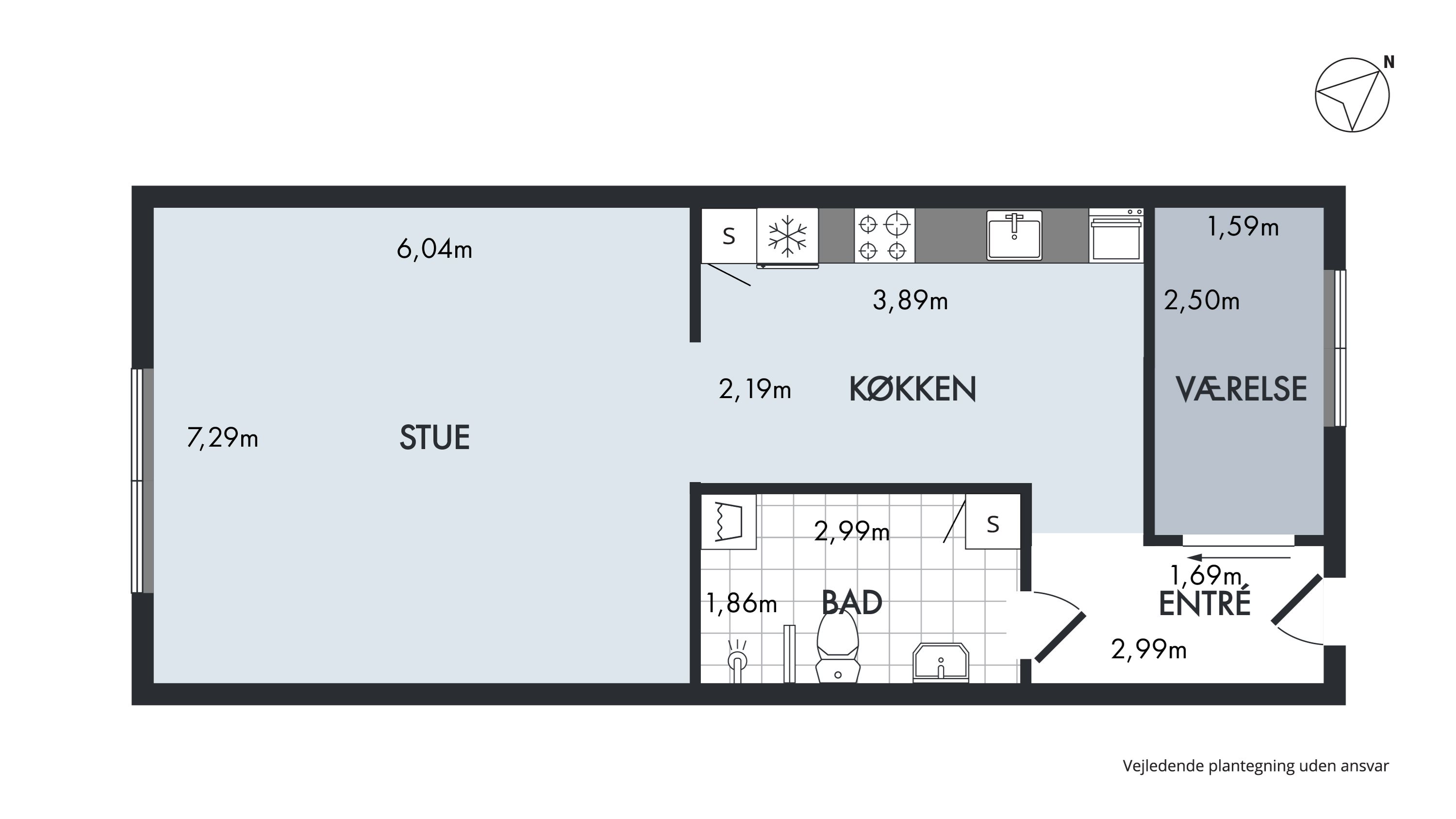 Boligen rummer 64 kvadratmeter i en praktisk planløsning uden spildplads. Stuen udgør halvdelen af hjemmet, og her kan tilværelsen nydes i indbydende og veloplyste rammer, hvilket må tilskrives det sydvestvendte vindue, som drager fuld nytte af dagenes soltimer. Der er god plads til at indrette både med spisebord, sofa og sågar et bord til kontorområde, uden at I skal føle, at I går på kompromis med hverken praktik eller æstetik. Køkkenet kommer i åben forbindelse heraf, og den ses med velholdt inventar og godt med skabsplads oppe som nede; og der er ligeledes plads til et mindre spiseområde. Slutteligt får I glæde af det regulære værelse, der takket være det nordøstvendte vindue er dejligt svalt, og det store badeværelse med både separatbruseniche, vaskefaciliteter, samt gulvvarme og således har I et helstøbt hjem, som er lige til at flytte ind i og tage i brug fra dag ét.