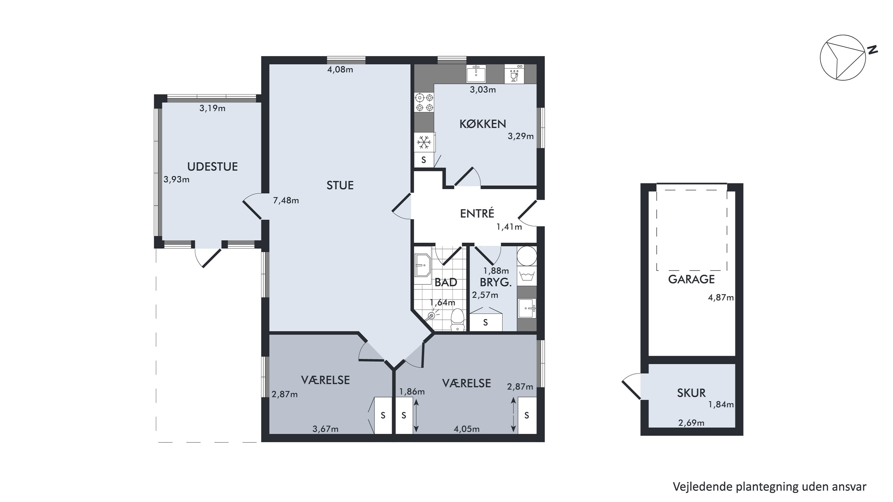 Inde venter en planløsning, der ikke lader noget plads gå til spilde. Entréen åbner op med en god størrelse og indhak til skab, og det bliver ekstra nemt at holde rummet ryddeligt, for på venstre hånd har du allerførst et godt bryggers med endnu mere opbevaringsplads. Dertil kommer et rummeligt badeværelse og to gode soveværelser i husets ene ende, mens en stor og lys stue, der ligger op til et veludstyret køkken, fuldender boligen.