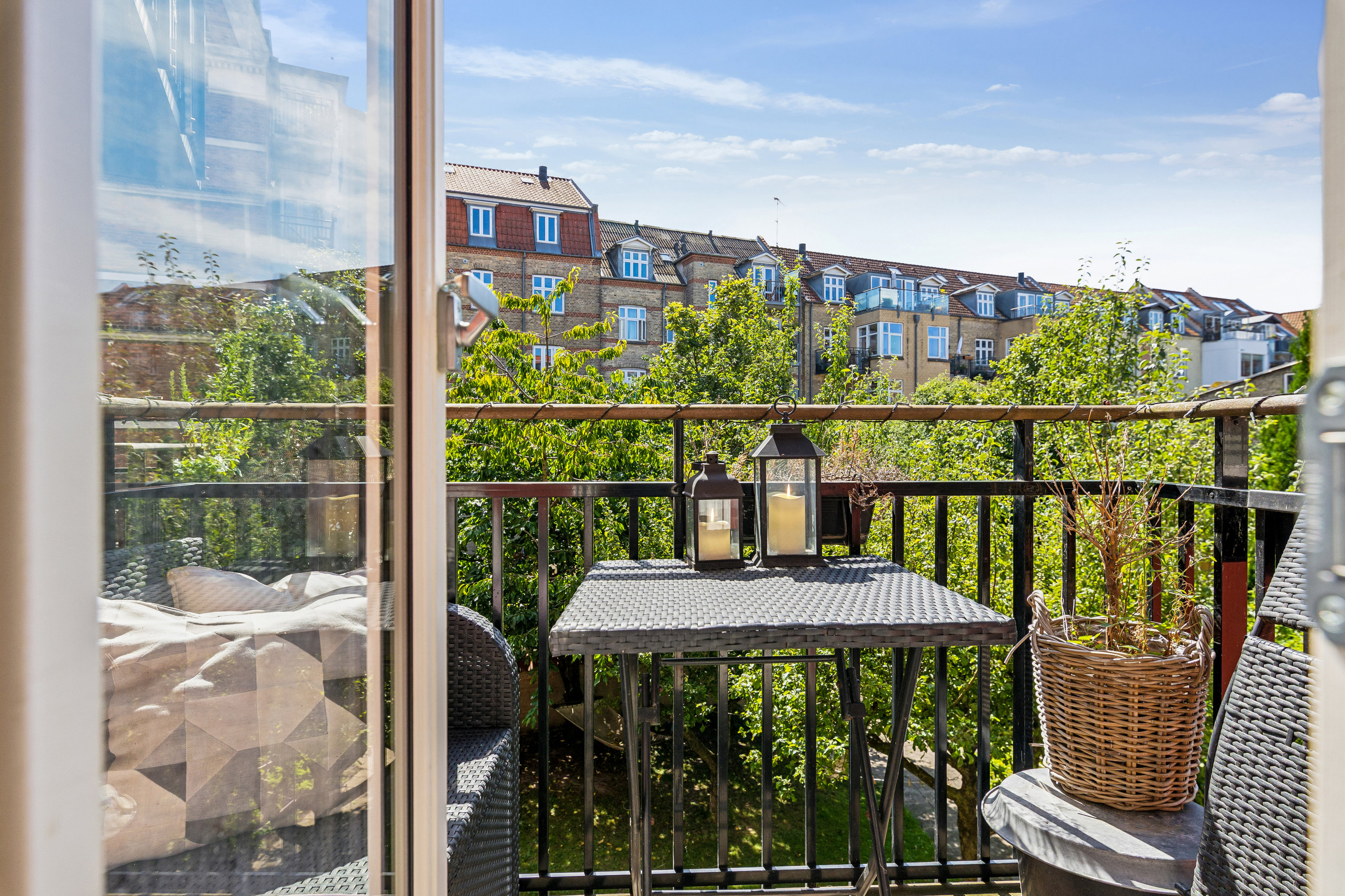 Vi bevæger os videre udenfor, men ikke længere end direkte ud fra det ene soveværelse, hvor glasdøren åbner op til en skøn altan, der vender mod sydøst. Her kan I nok nemt forestille jer at drikke morgenkaffen, når solen er på besøg - i øvrigt mens I nyder, at udsigten peger ned mod den stille, grønne gård. Gården, som ligger lige ud til Kærlighedsstien, deler I med ejendommens øvrige beboere; her får I god plads til vennebesøg, familiefødselsdage og til at stille cyklen, når arbejdsdagen er omme. I den fine ejendom får I desuden en vaskekælder til rådighed.