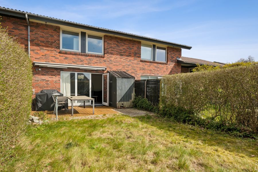 De røde rækkehuse præsenterer sig nydelige og velholdte inde som ude. Bebyggelsen ligger i et dejligt kvarter med lukkede veje og stisystemer og høje træer og grønne plæner. På én side af huset, mod solrige vest, finder I jeres hyggelige og alligevel overskuelige have med en dejlig terrasse i forlængelse af huset. Her kan I grille i aftensolens skær, og når solen bliver lidt for meget af det gode, kan I rulle markisen ned og sidde i skyggen.