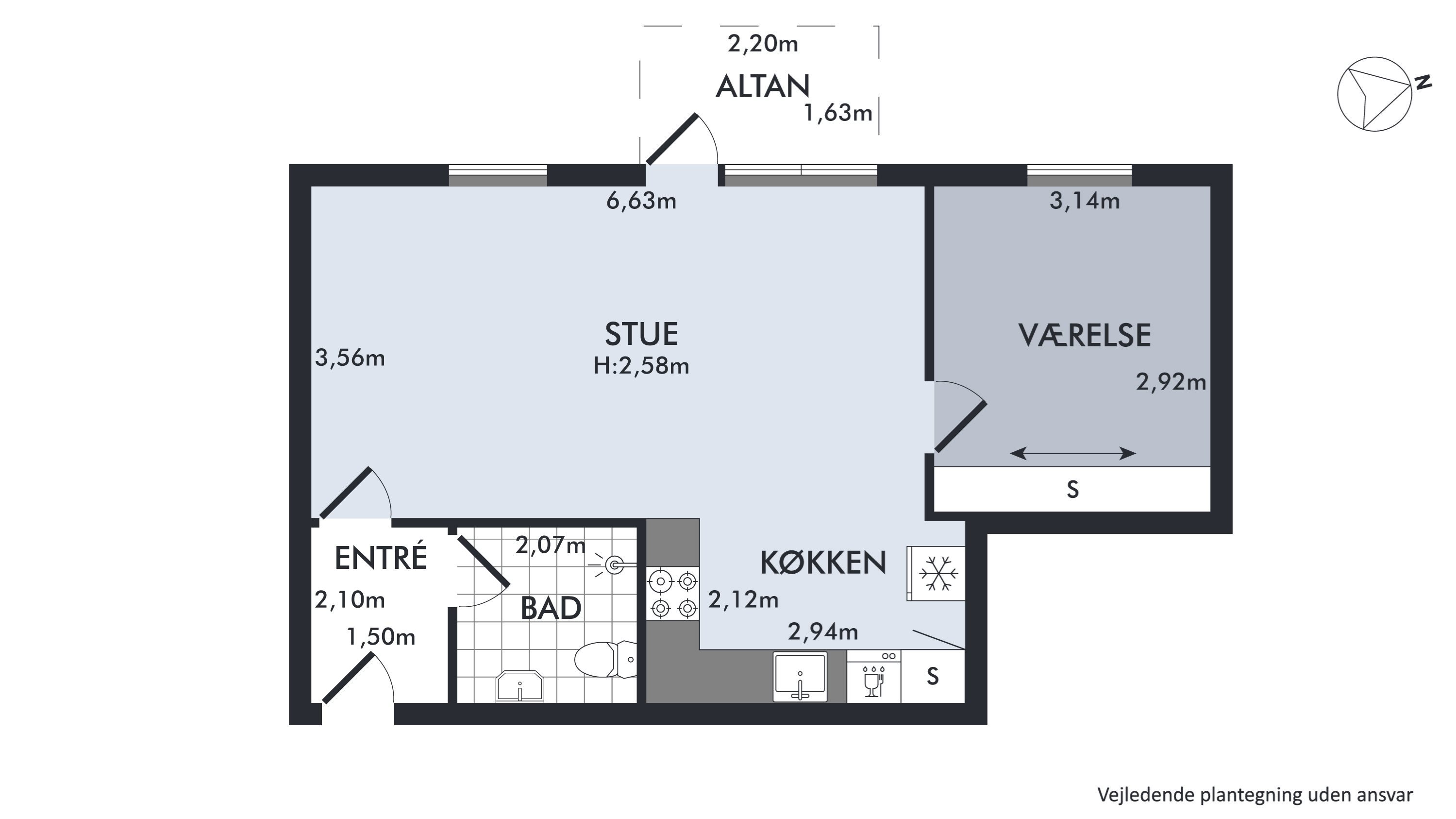 Du præsenteres for et hjem, som passer lige til singlens og parrets behov. Der er tale om en toværelses lejlighed med entré, værelse, bad, køkken og stue. Sidstnævnte giver adgang til altanen, og de vestvendte vinduespartier sørger for et behageligt lysindfald i det åbne opholdsrum, hvor samtalen kan flyde fra mellem køkkenbordet, spisebordet og sofahjørnet - den veldisponerede bolig er helt ligetil at indrette, og det gælder også for værelset. Dér byder skabsvæggen på god plads til hele garderoben, og det klassiske flisebadeværelse understreger praktikken med sin udmærkede plads - her kan vaskesøjlen også være.