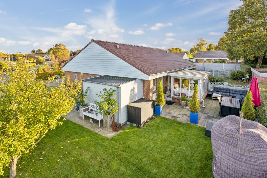 Der er også hygge at finde i haven, hvor solkroge og fliser smelter sammen med blødt græs. En god, velvoksen hæk gror ind mod naboen, mens et fint, langt bed fuld af alskens planter danner barrieren ud til fortovet. Dertil får du et godt skur, som rummer plads til både haveredskaber, cykler og opbevaring.