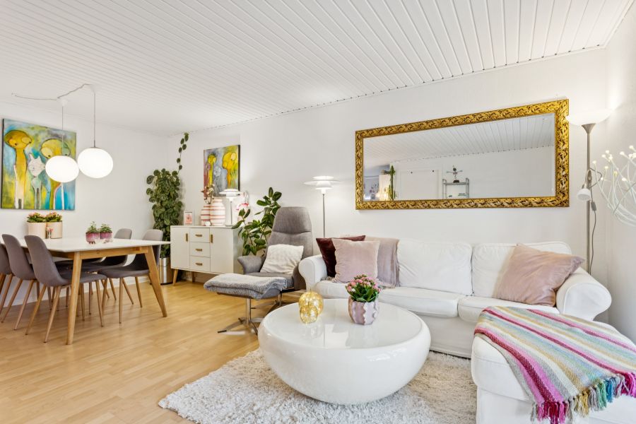 Det tidløse køkken har alt i hårde hvidevarer, og morgenlyset strømmer ind gennem vinduerne, som du, takket være gode vindueskarme, kan dekorere med blomsterkrukker og deslige. Stuens rammer indbyder til både middage og filmaftener, for det er her, du skal indrette dig med såvel spisebord som sofaarrangement – og når et større selskab er inviteret indenfor, kan du oplagt glide glasdøren til side, så opholdsrummet forlænges ud i den skønne udestue, der udgør nogle gode bonuskvadratmeter med kig til haven.