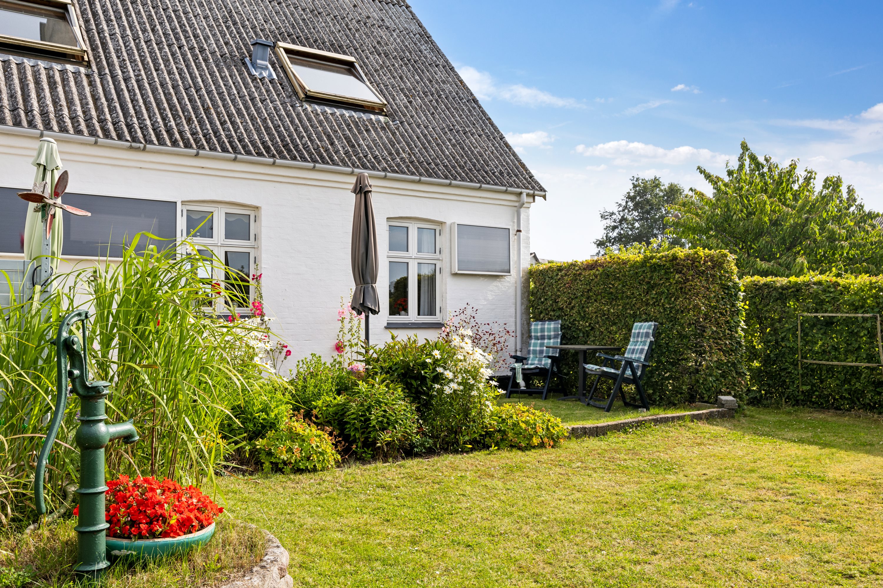 Ejendommen står på en 758 m2 stor grund, der foruden huset og et stort anvendeligt skur, byder på en pragtfuld ogstemningsrig have. Her er der terrasse, fine træer, blomstrende bede og masser af solchancer, og så sætter en gammel gårdpumpe stemningen for ultimativ landlig idyl. Sænk skuldrene, og lad roen falde på jer, mens en fantastisk udsigt breder sig for jer - måske vil I endda kunne spotte et får eller to. Indenfor fordeler de 127 m2 sig over to plan. På førsteetagen finder I ét stort fællesrum/stue med flere hyggekroge. De flotte fritlagte bjælker og de træbeklædte lofter skaber den helt rigtige sommerhus-stemning.
