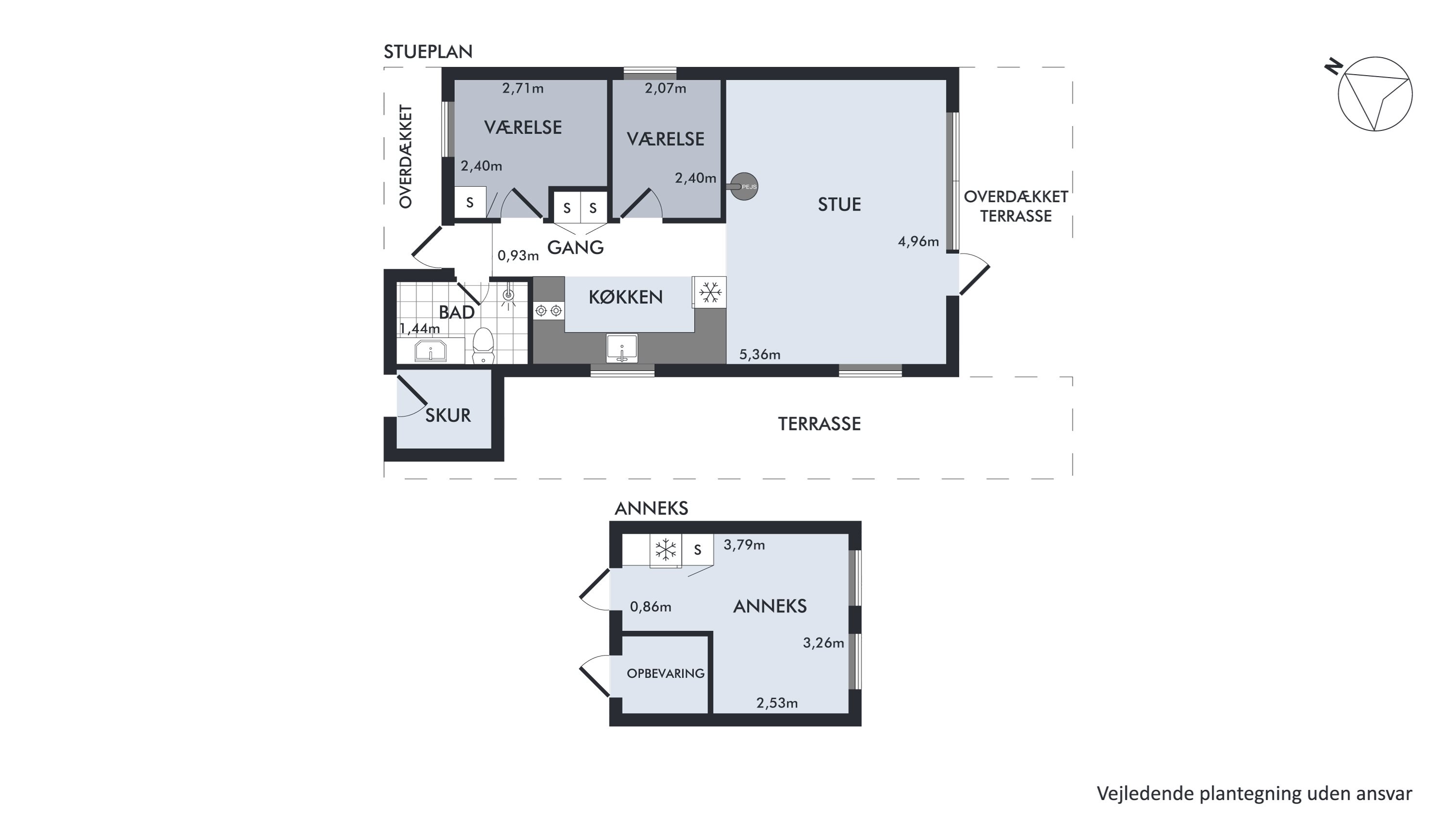 Lad os starte udenfor på den 1.254 kvadratmeter store grund, for det er her, I nok vil tilbringe mest tid, når I kører herop i forårets og sommerens weekender og ferie. Jeres matrikel er omringet af høje træer, der giver jer masser af privatliv - og der er masser af plads til at udleve privatlivets fred, for på den store, grønne græsplæne kan I etablere en bålplads, hvor I kan lave snobrød og grille skumfiduser, I kan sætte det store badebassin op, og I kan plante jordbærbede og ribsbuske. På træterrassen, der vender mod både syd og vest - de bedste verdenshjørner, hvis I skal nyde solskinstimerne - kan I grille, hygge og slænge jer i havemøblerne, og skulle sommerregnen nærme sig, rykker I bare under den del, som er overdækket. Weekendens og feriens gæster overnatter i annekset, og alle redskaberne opbevarer I bare i skuret.