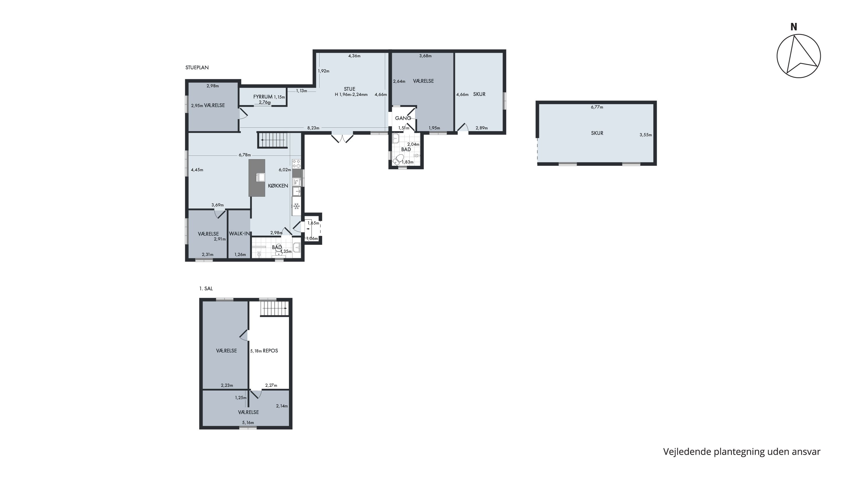 Turen starter i vindfanget, hvor hoveddøren slår op til det fantastiske køkken. Her blander blotlagte bjælker og rå murstensvægge sig med moderne køkkenelementer og integrerede hvidevarer. En lækker farvepalette byder på varme jordfarver, mens spots i lofterne og et østvendt sørger vindue for masser af lys over madlavningen. På den anden side af køkkenøen venter det, der med fordel kan indrettes som spisestue, mens et badeværelse med brus samt et værelse med walk-in venter til venstre. Længere inde i huset får I endnu et badeværelse, to værelser og en skøn stue, hvor dobbeltdøre i glas lader jer åbne op til haven og invitere sommerbrisen indenfor. Afslutningsvis byder førstesalen på en repos og husets to sidste værelser.