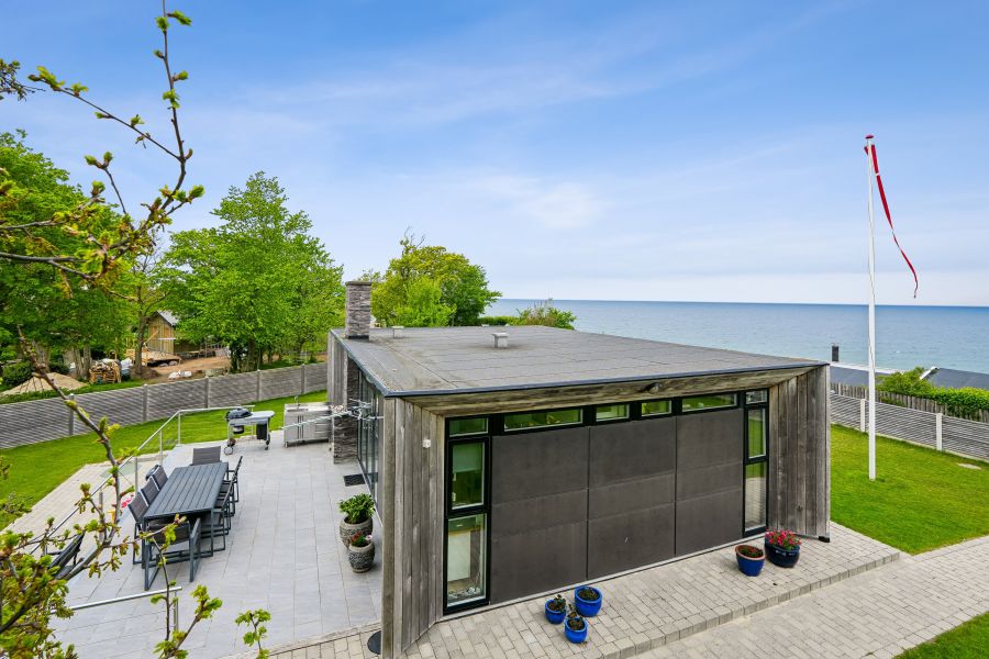 Udenfor er der ikke noget at sige til, hvis I bliver betaget af villaens facade, og næsten helt glemmer at lægge mærke til de skønne omgivelser omkring. Villaen er nemlig bygget i en helt unik arkitektonisk stil med flotte planker, der suppleres af grå facadeplader og de førnævnte høje vinduespartier. Når I alligevel river blikket væk fra villaen, skal I lægge mærke til den stilrene, hævede terrasse, som vender mod syd og dermed byder masser af sol velkommen hele dagen. Villaen og terrassen omkranses af en stor, grøn plæne med god plads til selskaber og leg - og selvfølgelig til at spadsere omkring og nyde udsigten over kysten. Haven er stor så der er plads til spil og aktiviteter for børn og børnebørn, men heller ikke haven kræver den store pleje, da plænen klares af den effektive robotplæneklipper. Dertil er der etableret ladestander til elbil.