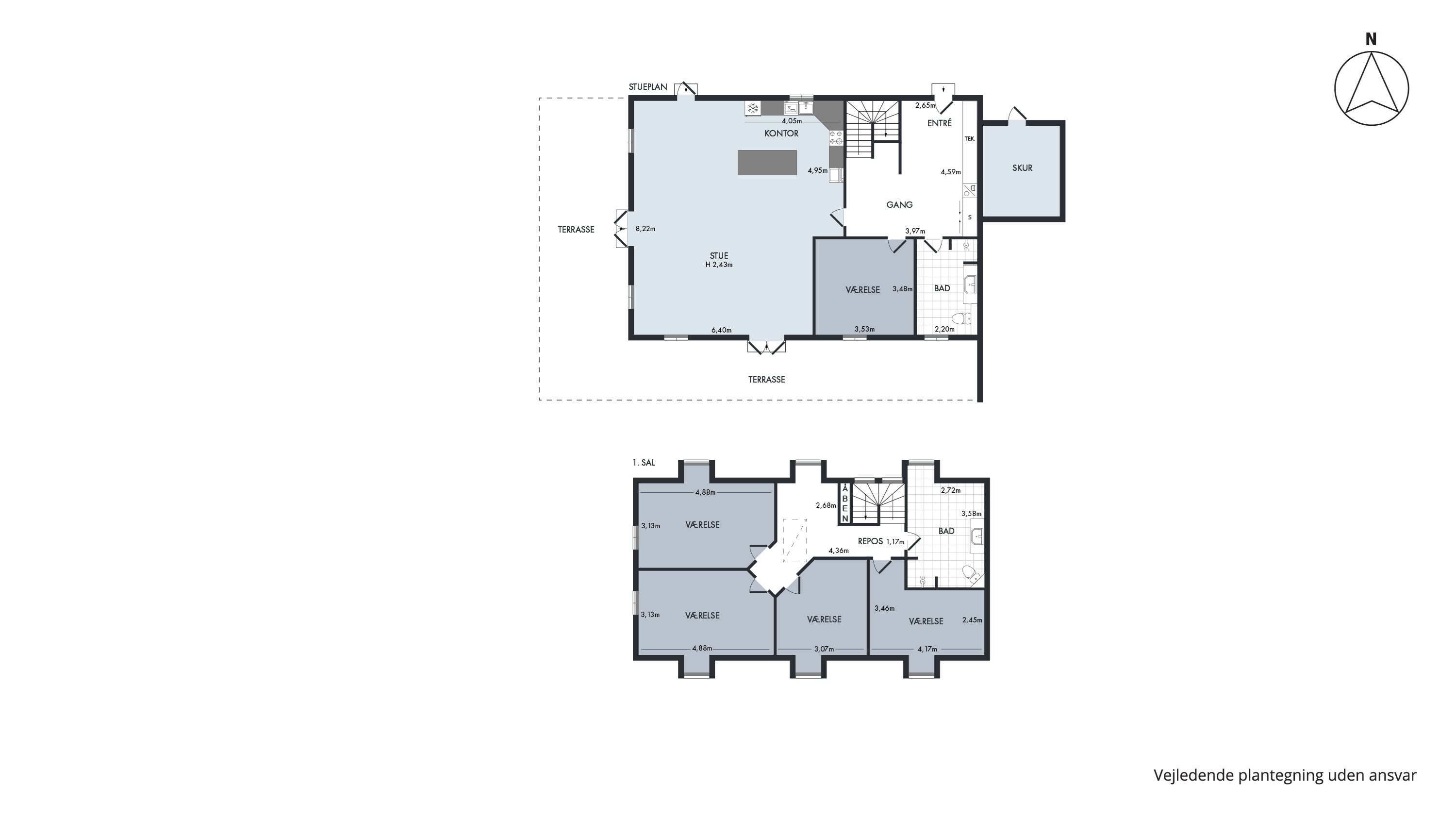 Denne unikke bolig på 200 kvadratmeter fra 2008 byder på en god planløsning fordelt over to etager. Ved ankomsten bliver I mødt af en elegant entré og hall med skakternet gulv og smart indbygget skabsplads med vaskesøjle. Dette fører jer videre til det moderne badeværelse, det store, åbne leverum samt et rummeligt værelse, hvor I kan indrette jer efter behov. Her præsenterer det strømlinede køkken sig med grebsløse fronter, integrerede hvidevarer og en praktisk køkkenø, der åbner op til både spise- og opholdsstuen. De sprossede vinduer lader det naturlige lys strømme ind og giver jer samtidig en betagende udsigt til den omkring liggende natur. På første sal venter en rummelig repos, der fører jer til fire velindrettede værelser, og endnu et stilfuldt badeværelse med elegant inventar. Her er der masser af plads til både privatliv og fælles samvær.