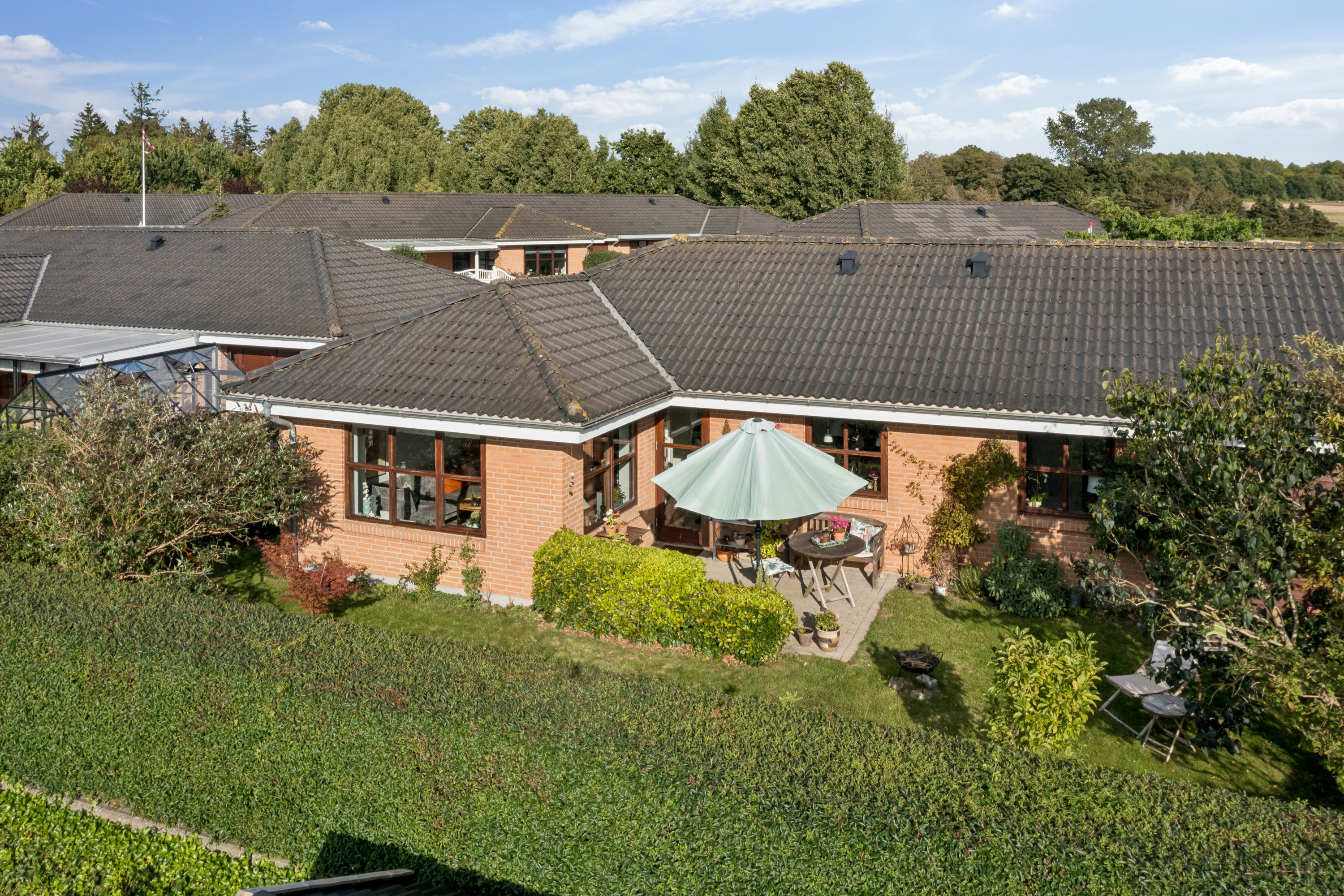 I køkken-alrummet kan I stille terrassedøren på vid gab og lade de indre leverum flyde sammen med den utroligt hyggelige have, der følger med i huskøbet. Herude tilstøder en fliseterrasse huset og omsluttes af en fin plæne. En god hæk og indslag af anden beplantning giver et nøk op på charmen, mens havens orientering mod vest, og dermed dagens bedste soltimer, binder en sløjfe om hele herligheden.