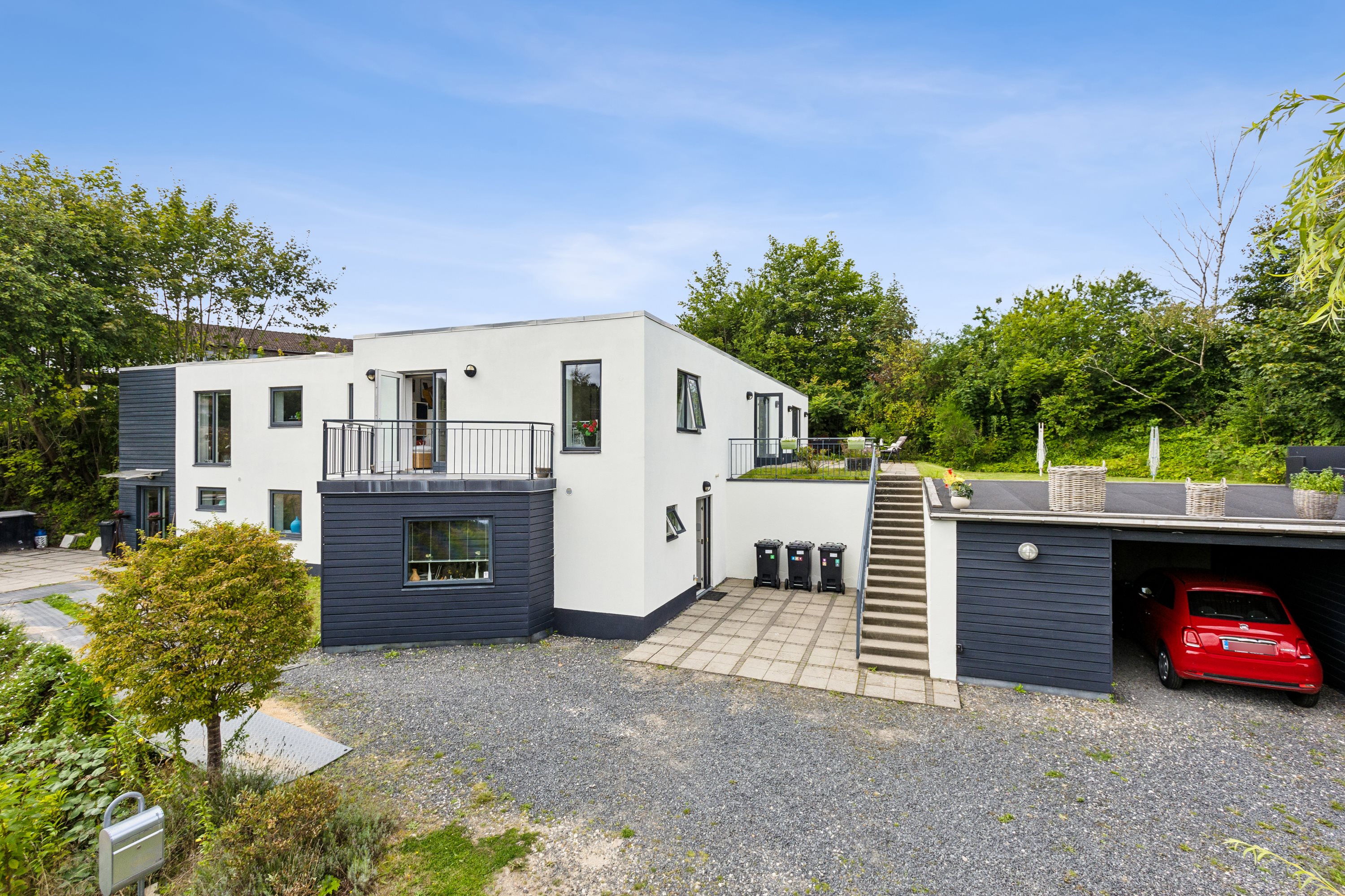 I 1952 stod huset færdigt, og I overtager den ene halvdel. En hvid facade byder jer velkommen i de grønne omgivelser, og går I op ad trappen, når I de store udeområder, der indrammer huset. Heroppe i højderne på den flisebelagte terrasse og på taget af carporten vil en rigtig fin udsigt over de grønne vidder brede sig ud for jer, og I får masser af plads til grillen, terrassemøblerne og solbadningen - der er desuden en altan i forbindelse til et af værelserne. Carporten kan ikke bare bruges som terrasse, men selvfølgelig også til bilen, og i forbindelse til den er der et skur.