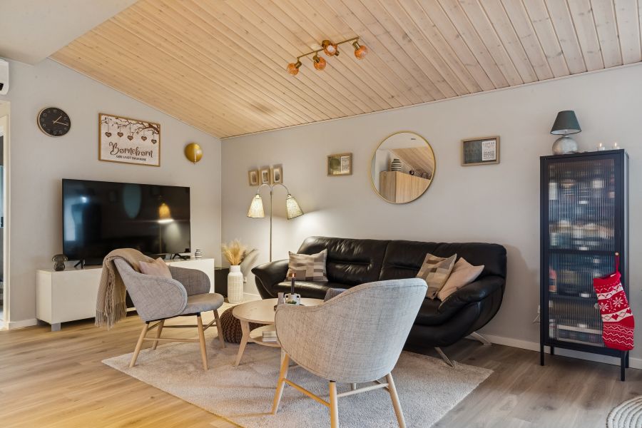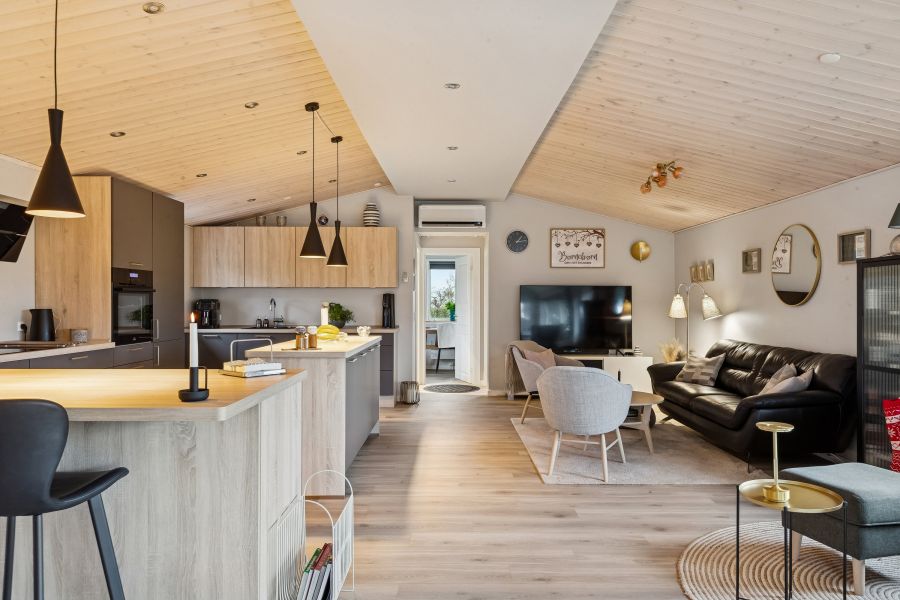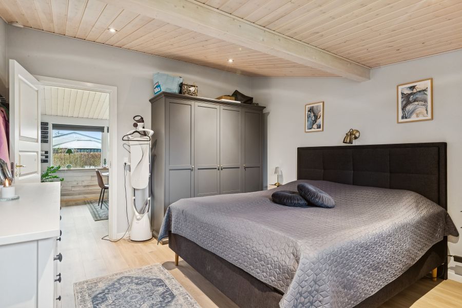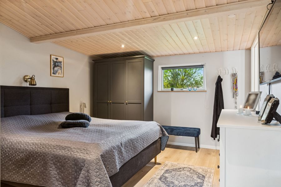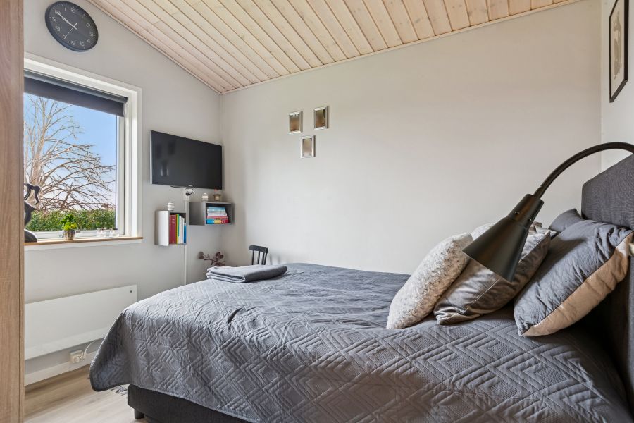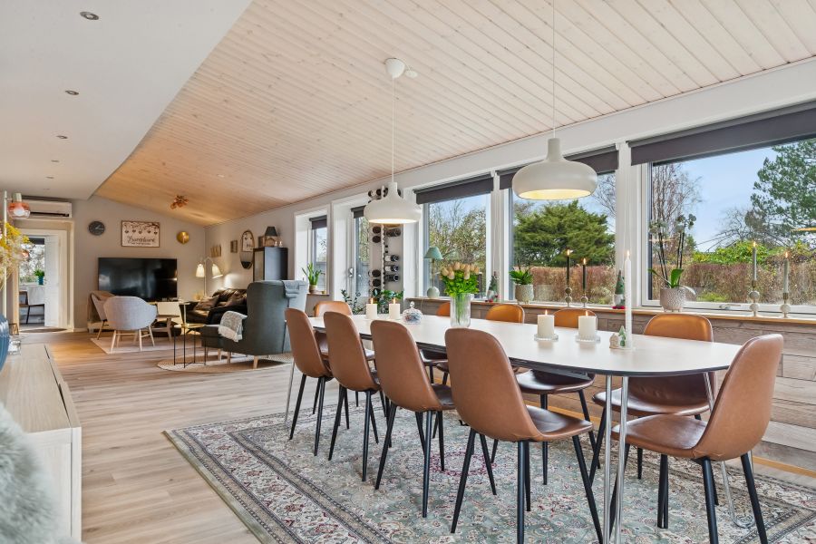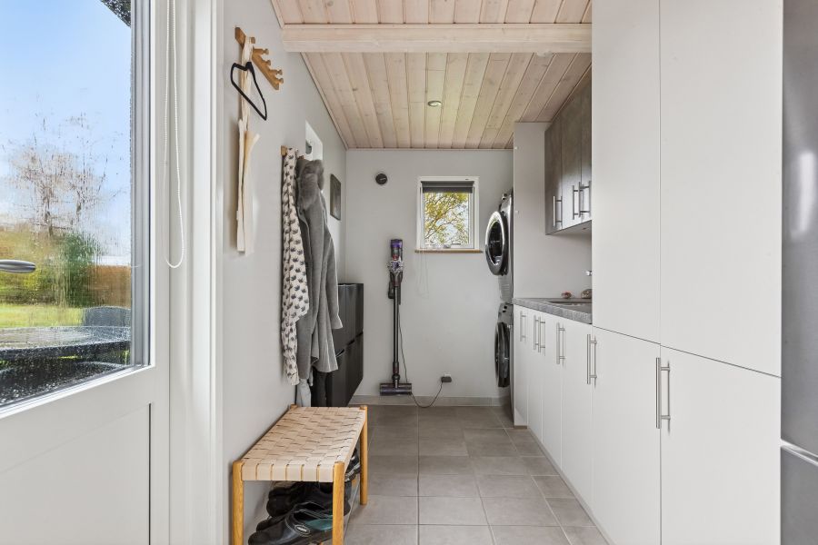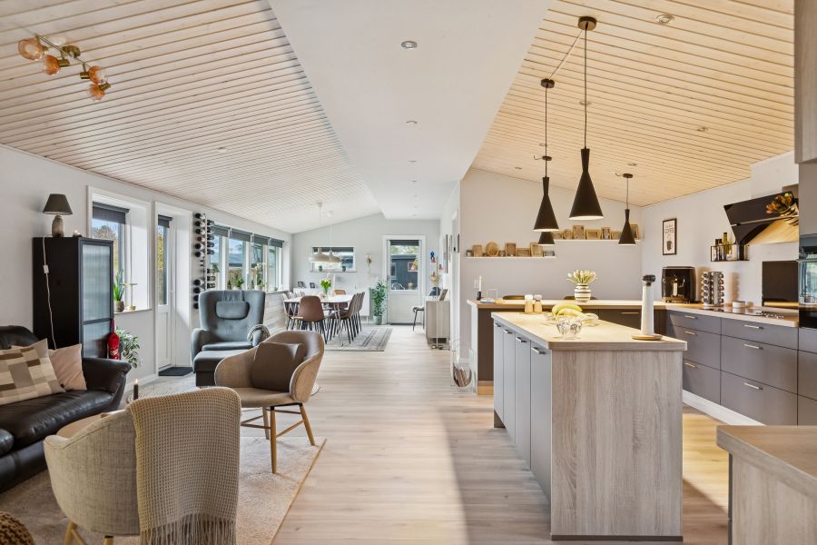 Indenfor møder du lyse og indbydende rum. Det naturlige samlingspunkt bliver det store, åbne opholdsrum med køkken og stue i én harmonisk forening. Det stilrene køkken byder på gode skabsløsninger og alle nødvendige hvidevarer. Stuen prydes af store vinduespartier, som lader dagslyset strømme ind og giver et skønt kig til haven. Herudover får du tre værelser, hvoraf to ligger samlet med adgang til et brusebadeværelse, mens det tredje er placeret separat og har eget, tilknyttet badeværelse. Afslutningsvis rummer sommerhuset også et praktisk bryggers.