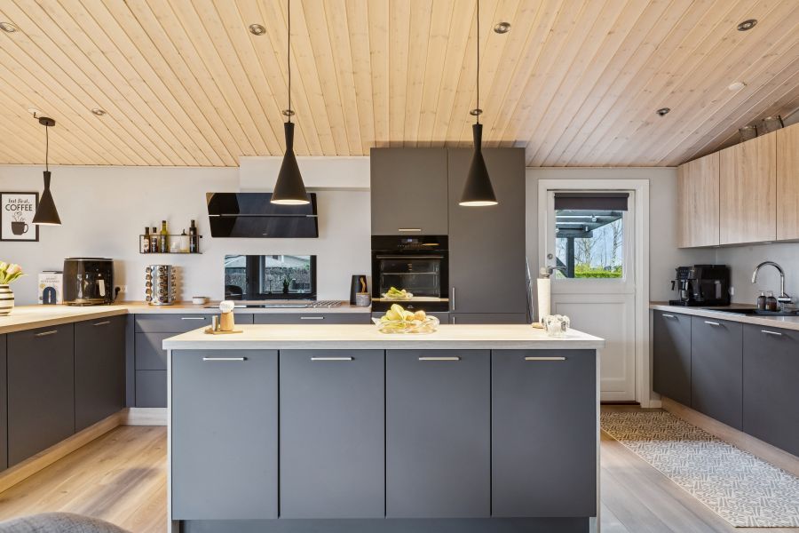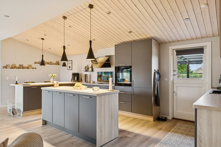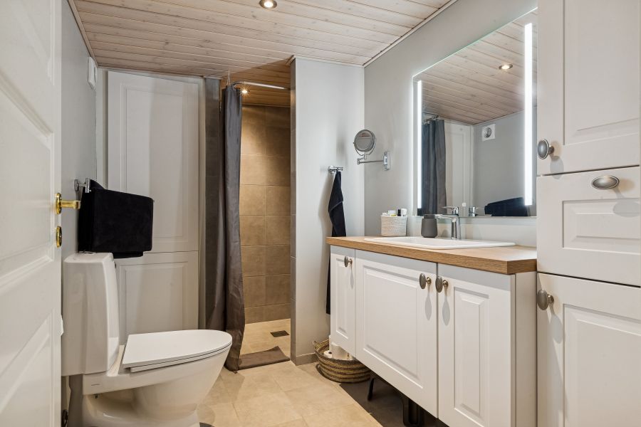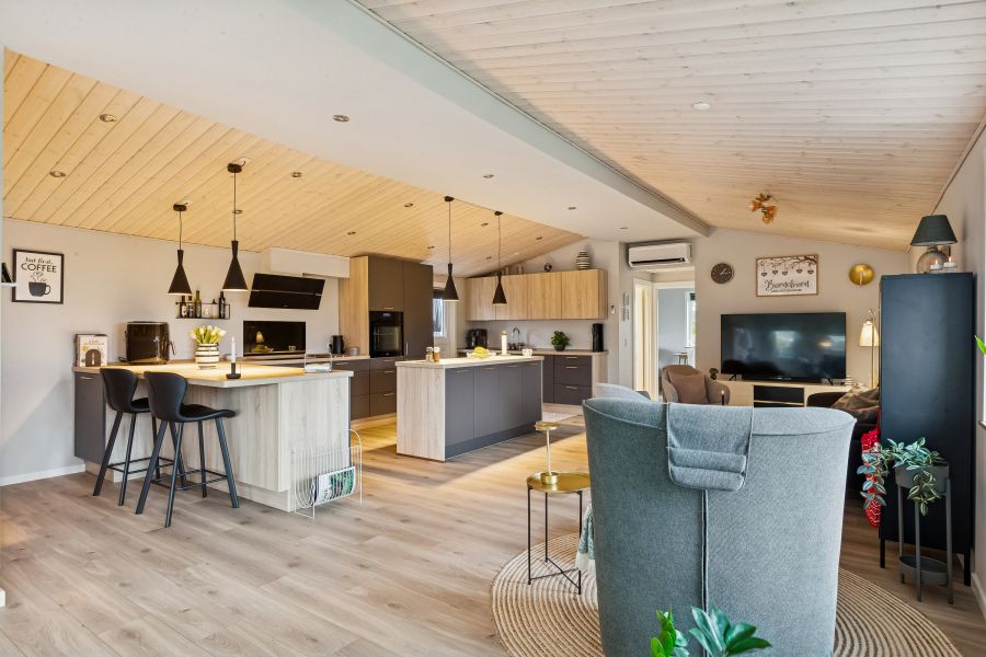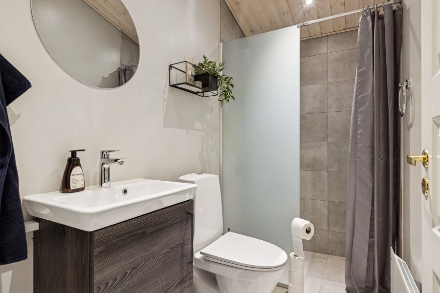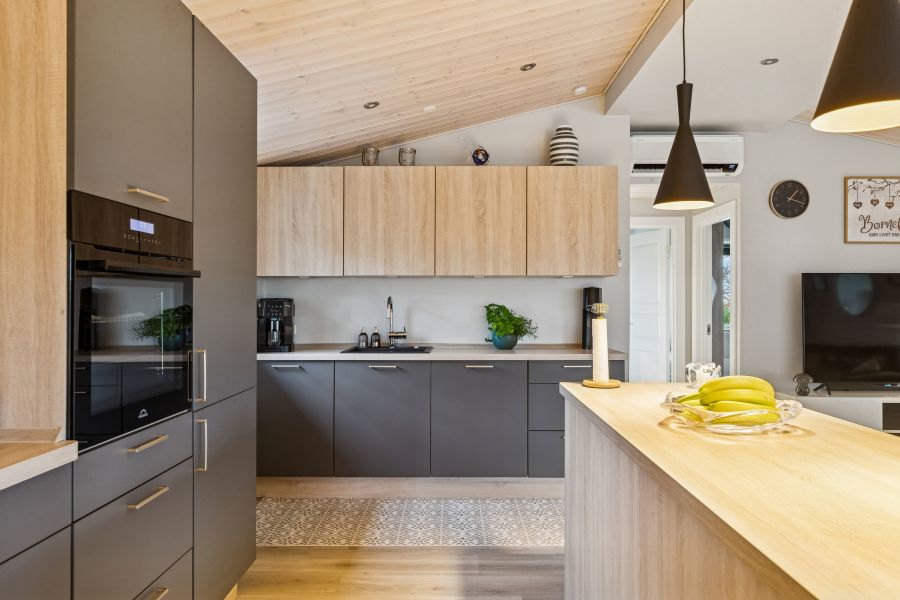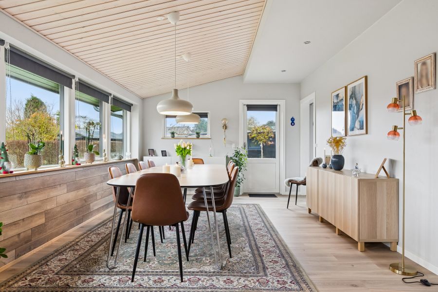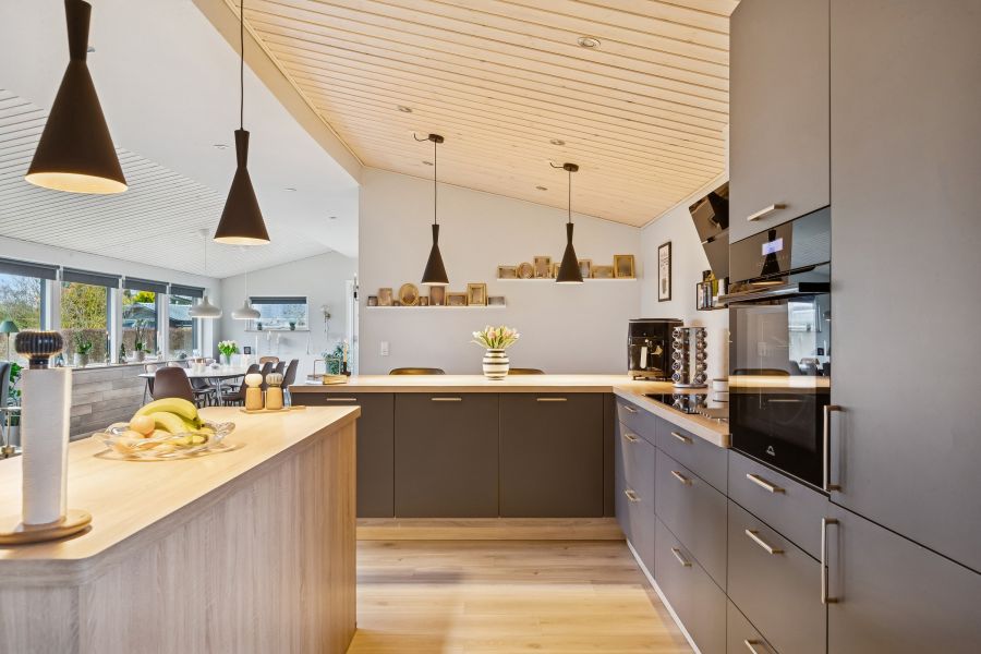 Indenfor møder du lyse og indbydende rum. Det naturlige samlingspunkt bliver det store, åbne opholdsrum med køkken og stue i én harmonisk forening. Det stilrene køkken byder på gode skabsløsninger og alle nødvendige hvidevarer. Stuen prydes af store vinduespartier, som lader dagslyset strømme ind og giver et skønt kig til haven. Herudover får du tre værelser, hvoraf to ligger samlet med adgang til et brusebadeværelse, mens det tredje er placeret separat og har eget, tilknyttet badeværelse. Afslutningsvis rummer sommerhuset også et praktisk bryggers.