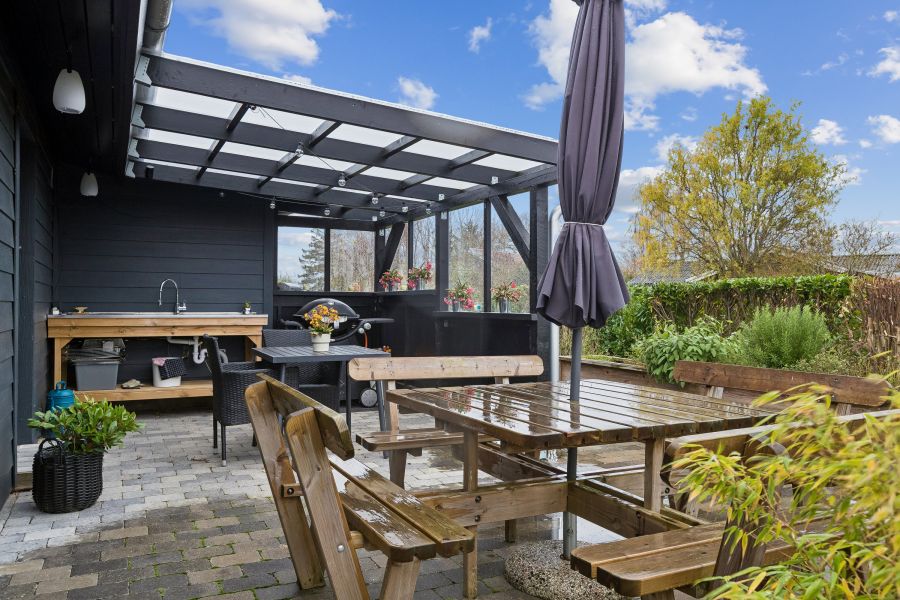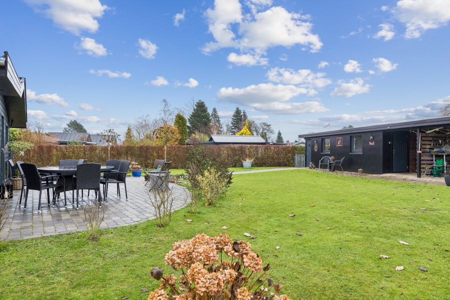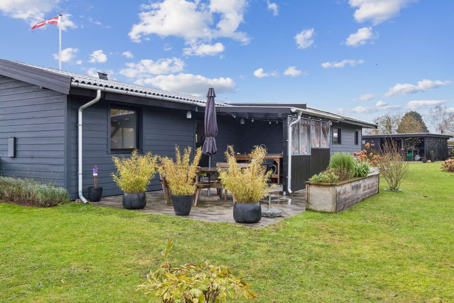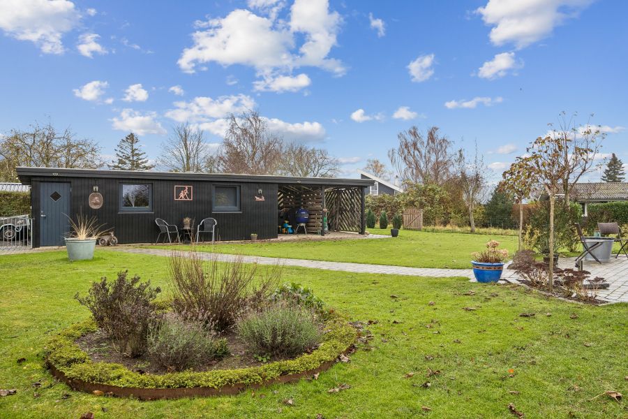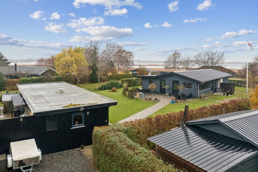 Sommerhuset præsenterer sig flot med sin mørke fibercement , der skaber en smuk kontrast til de grønne omgivelser. Grunden er anlagt vedligeholdelsesnemt med en stor græsplæne, der afskærmes af en tæt hæk. Den ene terrassen er fordelagtigt orienteret mod vest, og en del af arealet er overdækket,der er hele 3 terrasser rundt om huset, så sol i haven hele dagen er lige prikken over det skønne haveareal .der er udsigt til inderfjorden både indefra huset og flere steder i haven.så du kan nyde udelivet selv på sene aftener. Foruden selve sommerhuset rummer grunden også et udhus med værksted samt et anneks.