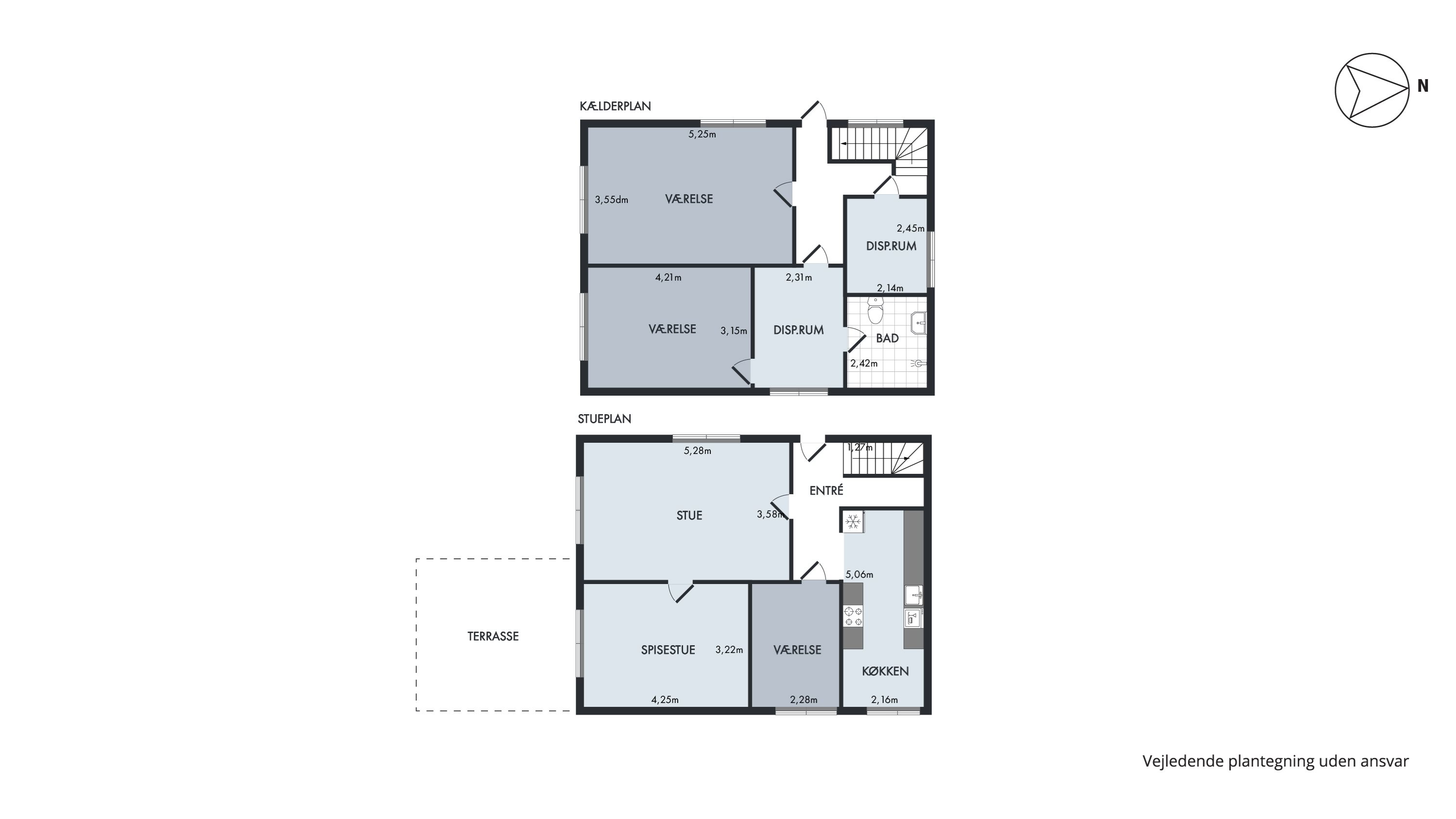 Fra entréen bevæger du dig videre ned til den højloftede kælder, som rummer et stort værelse med masser af anvendelsesmuligheder, et vaskerum, et depotrum og et badeværelse.