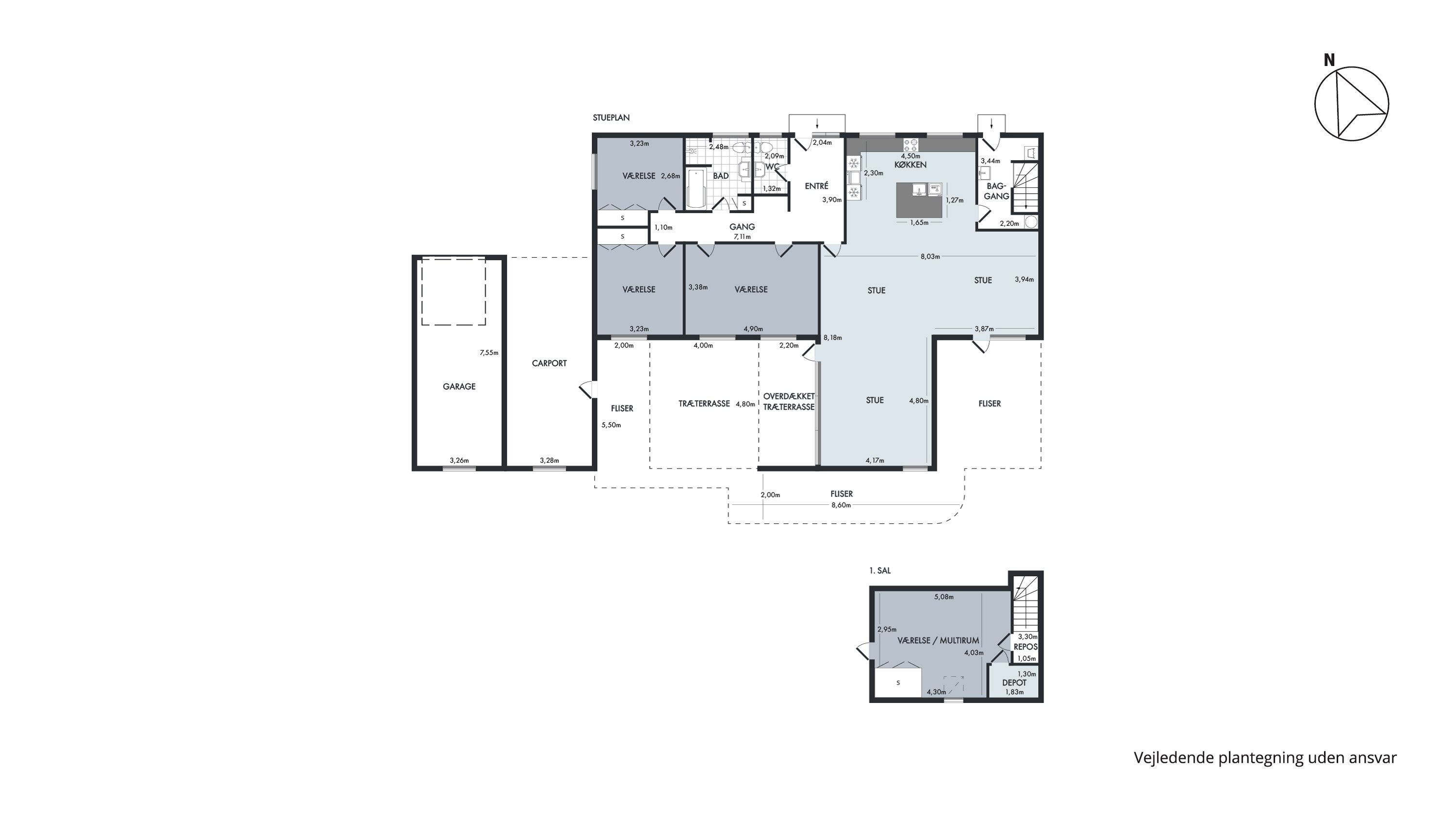 Indvendigt starter herlighederne i det velplejede hus. Man bydes velkommen af den indbydende entré, hvor der er plads til opbevaring af overtøj. Derfra har man adgang til det store køkkenalrum, selve køkkenelementerne er holdt i en moderne stil, som blander mørke og lyse farver. Køkkenalrummet er i en åben planløsning elegant forbundet, der er adskilt af den fine køkkenø. I den store stuedel får I lys strømmende ind af de gulvlange vinduer, samt rummelighed med plads til spise- og opholdsstuen. Stueetagen byder også på 3 dejlige værelser, hvor det store børneværelse kan omdannes til 2 værelser, samt et fint gæstetoilet og badeværelse. Badeværelset er holdt i en tidløs stil med lyse farver, det har desuden den luksus, at der er badekar og separat brus. På førstesalen findes et dejlige værelse eller multirum.