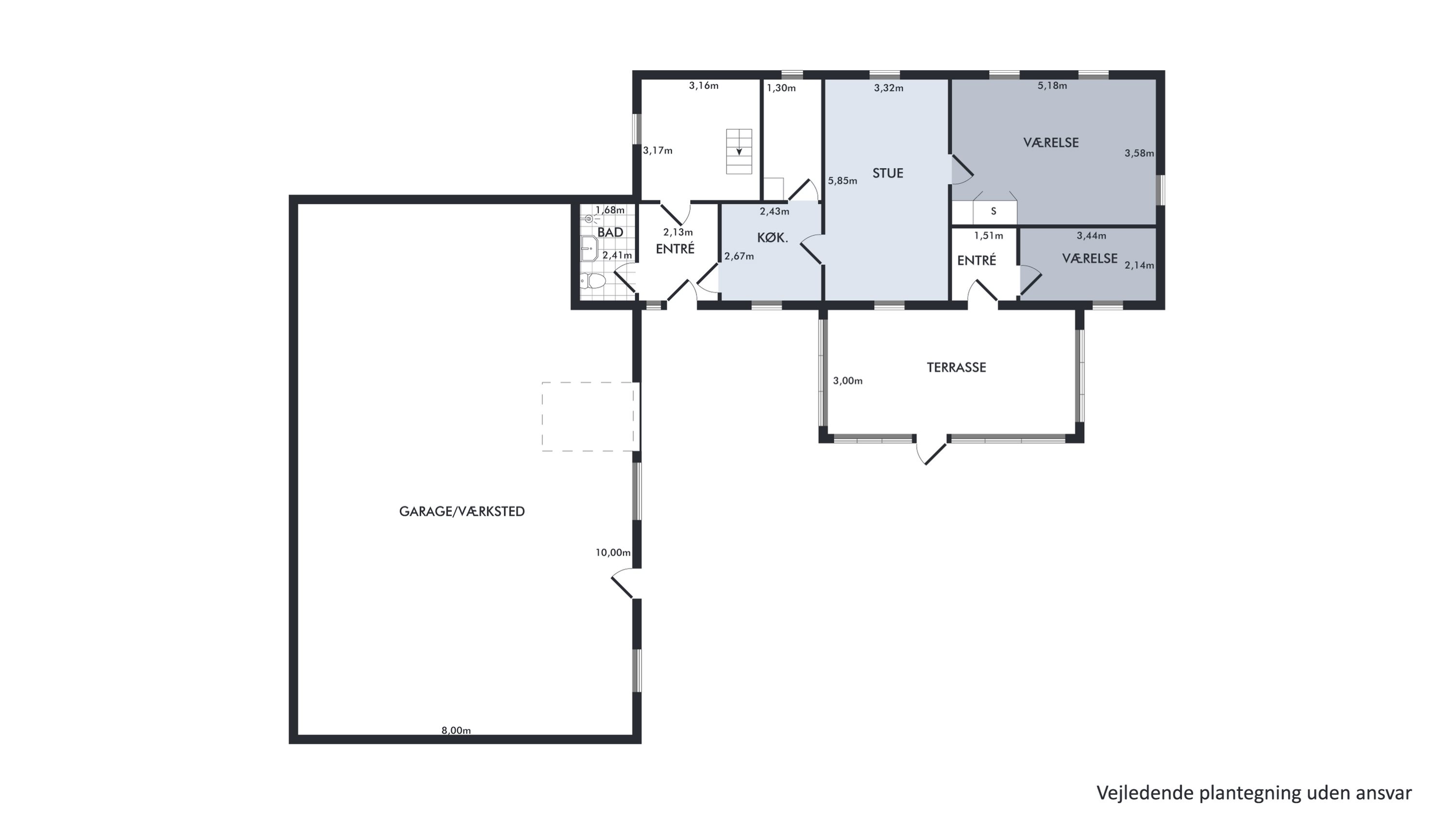 Som planløsningen er nu, kan I træde ind i entréen med badeværelset på venstre hånd og køkkenet på højre hånd. Herfra kan I se nærmere på to disponible rum, en stor stue med god plads til både sofaarrangement og spiseafsnit samt to værelser. Det ene værelse har adgang til baggangen, hvorfra I kan gå ud i den hyggelige udestue med store vinduespartier, der tager jer tættere på udearealerne.