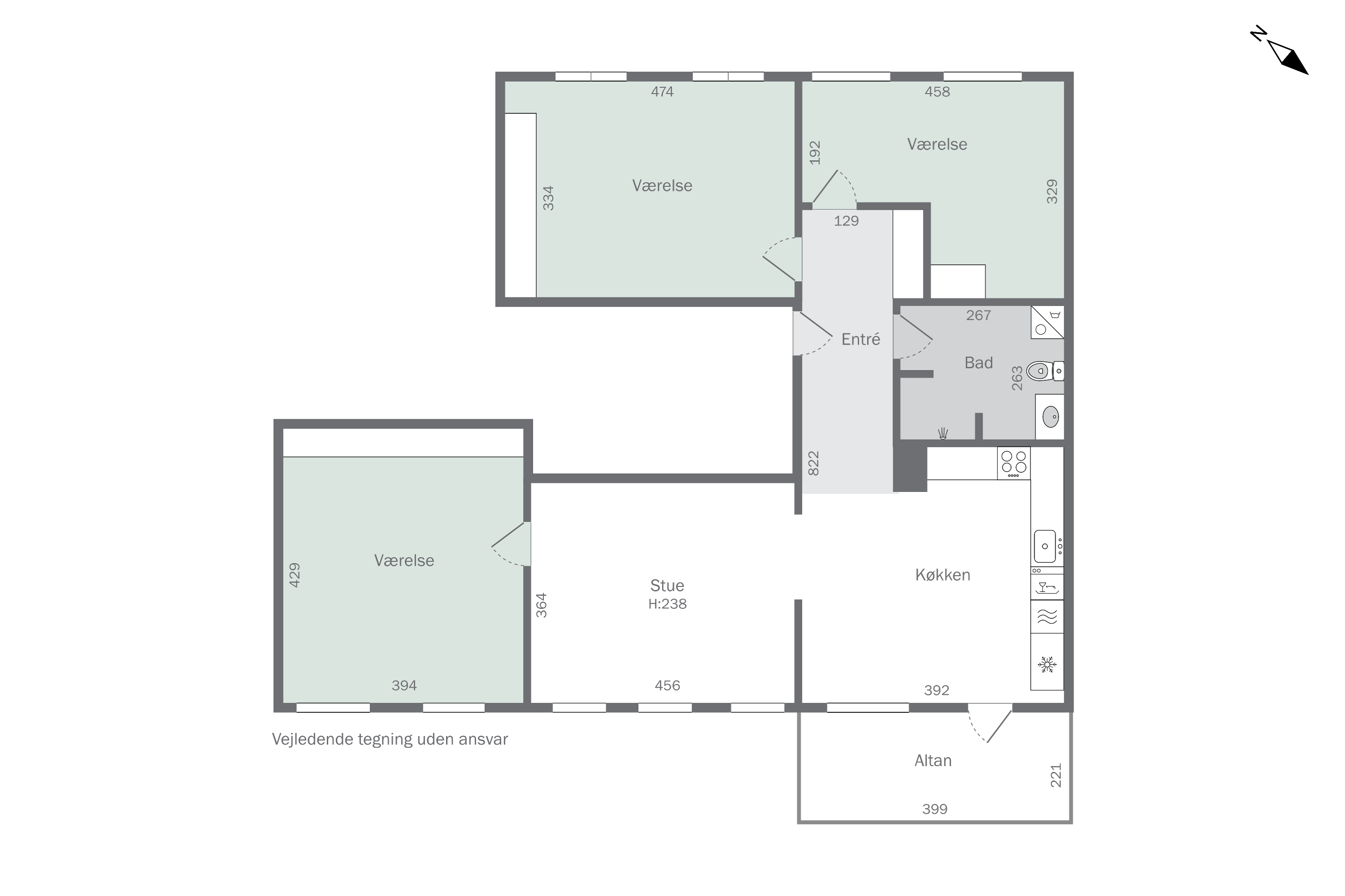 Lejligheden rummer tre værelser, alle med indbygget skabsplads. Det største værelse ligger separat og er ideelt som forældreafdeling, mens de to andre værelser ligger tæt ved det rummelige badeværelse med brus og vaskesøjle. Denne opdeling gør lejligheden perfekt for børnefamilien eller dem, der ønsker rigeligt med plads eller hjemmekontor.