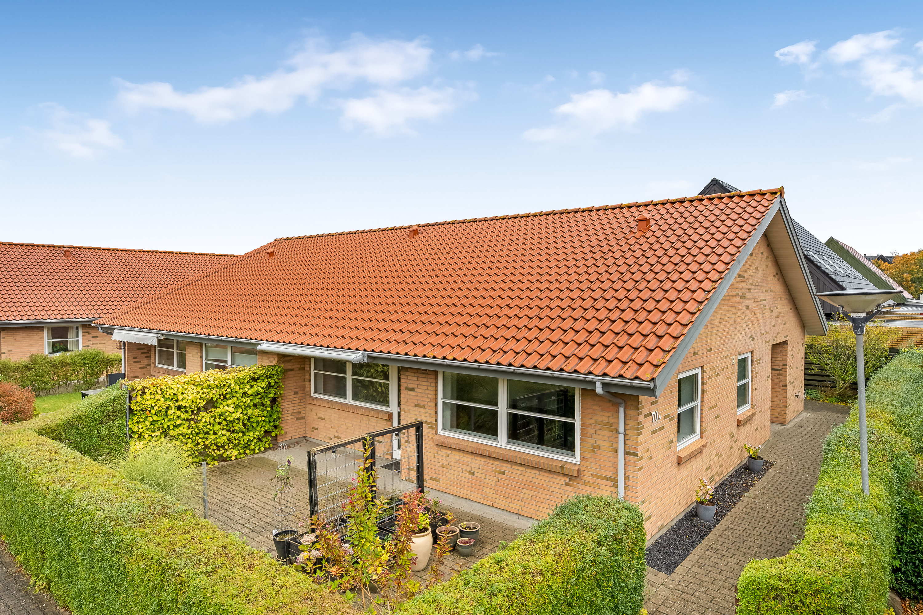 I boligens private afdeling finder du et pænt soveværelse, et rummeligt badeværelse med bruseniche samt et praktisk bryggers med vaskesøjle og rigelig opbevaringsplads.