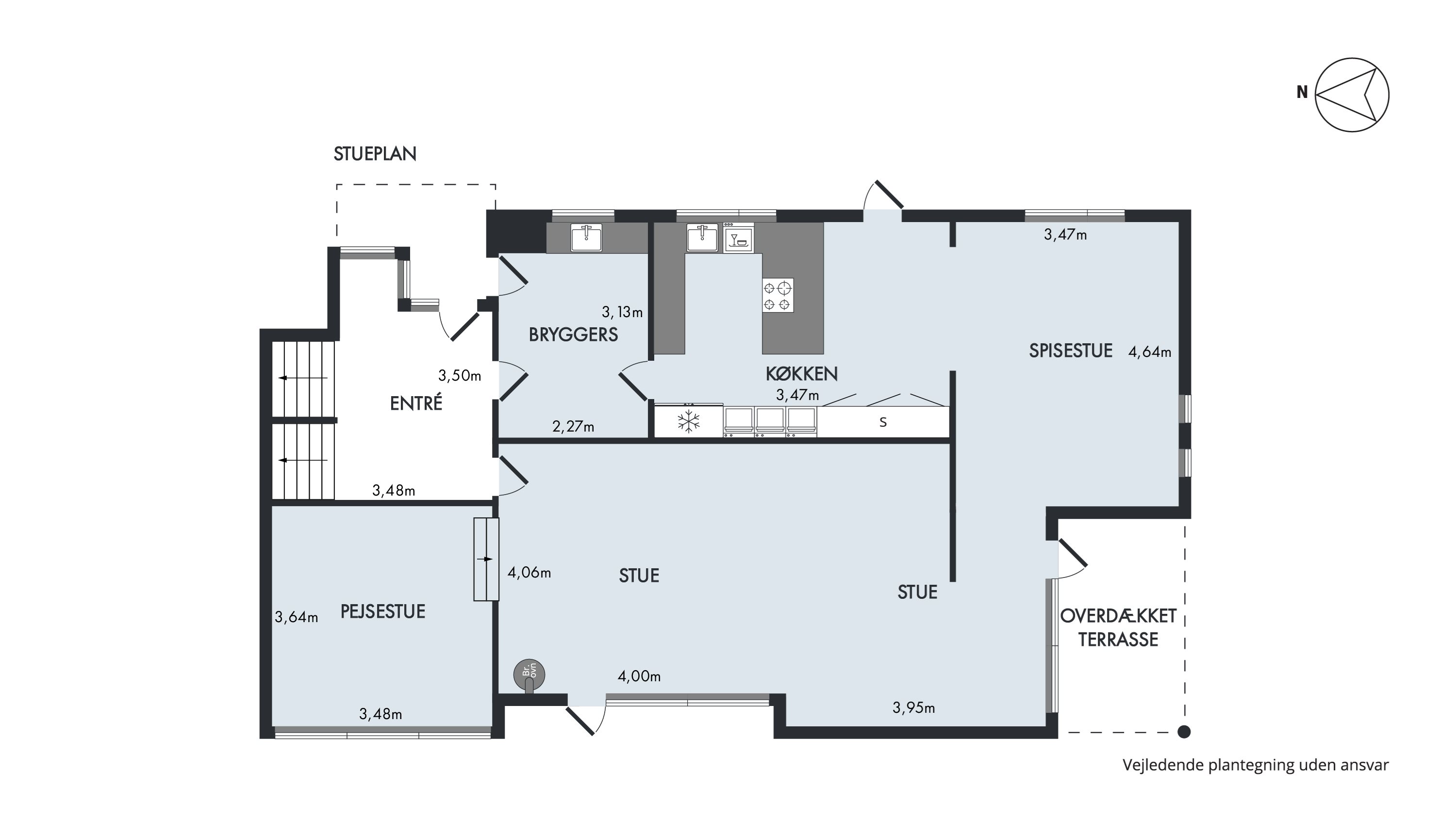 Rundturen begynder i en stor lys entré, herfra folder boligen sig ud. I den ene ende finder I et dejligt lyst bryggers, hvorefter i træder ind i et flot køkken med spisestue for enden af køkken, her får du stort køkken med nye hvidevare bl.a. køleskab med kold vand, fryser med isterninger, indbygget kaffemaskine mm, herefter kommer i ind i en stor lys stue med plads til hele familien og med egen bar. Husets førstesal byder på hele to badeværelser og 2 gode værelser med havudsigt – soveværelset er med stort walk-in til garderoben.