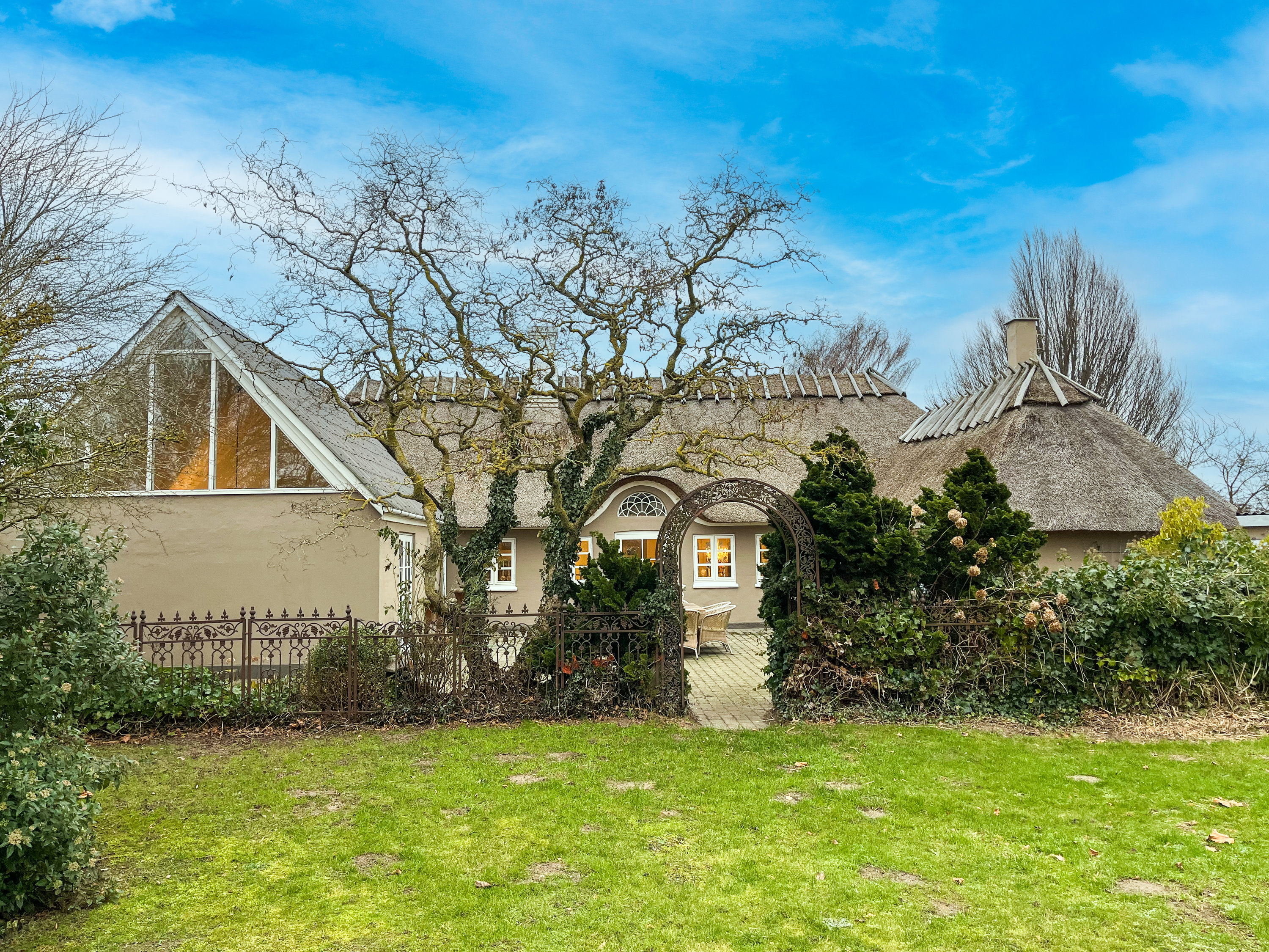 Huset fremstår nydeligt med stråtækt tag og småsprossede vinduer, og selv carporten er ikke kun praktisk - den er også charmerende med buede vinduespartier og åbninger mod haven. Rundt om huset er der skabt det skønneste terrassemiljø, som danner en slags gårdhave mellem hjemmets tre længer og forgrener sig ud i haven med mulighed for at indrette flere opholdszoner. Med 1.398 kvadratmeter grund er der desuden plads til alt fra køkkenhave til leg på plænen.