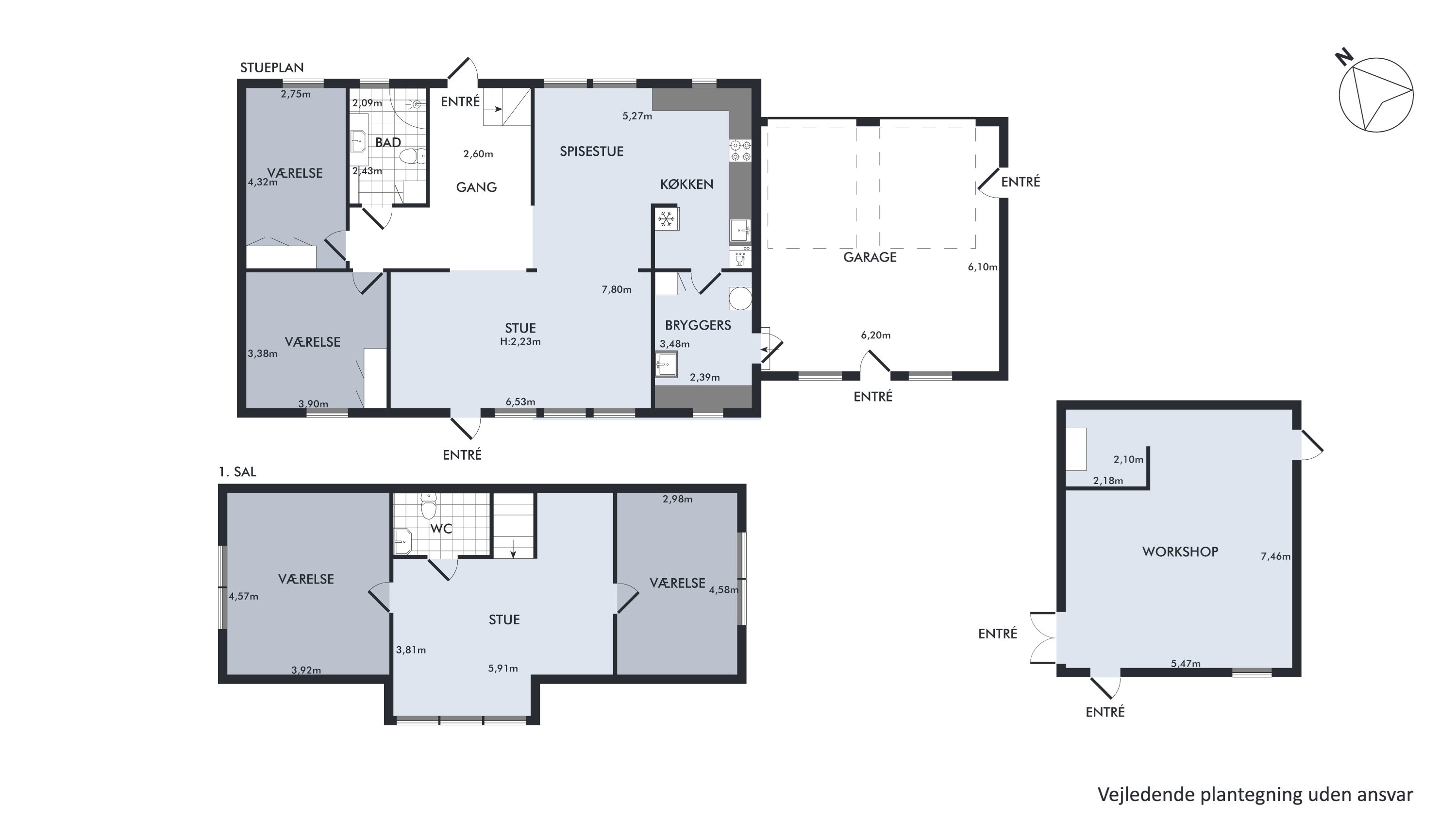 Kom med ind bag hoveddøren. Her venter hele 185 boligkvadratmeter på jeres møbler og flyttekasser, og det er bare med at rykke direkte ind, for huset er lyst, og indflytningsklart hele vejen rundt. Lad os tælle rummene: I stueplan finder I to værelser, et bryggers, et badeværelse og en stue med køkken-alrum. Og et par trappetrin længere oppe på 1. sal finder I endnu en stue, et WC og to værelser. Hvad giver det lagt sammen? Det giver en skøn bolig med god plads til hele familien.
