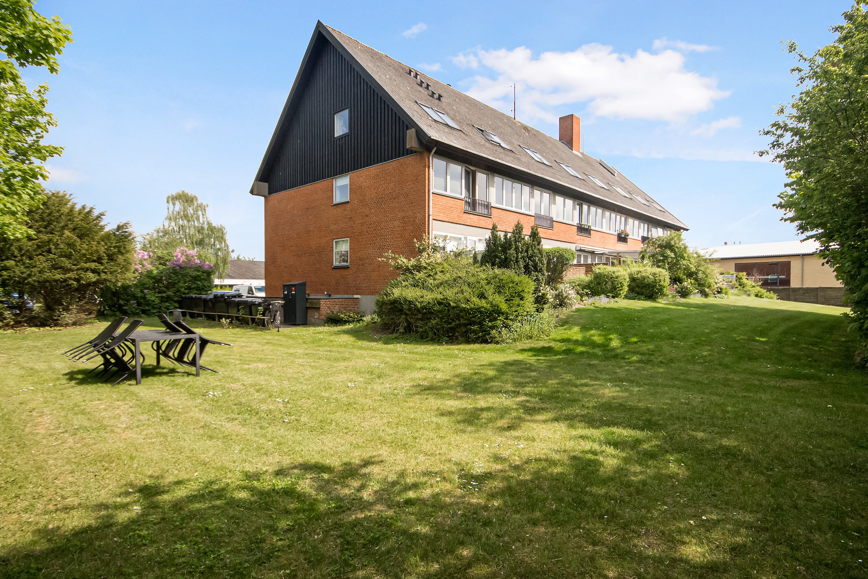 Lejligheden er en del af en velholdt ejendom fra 1968. Det mørke tag hviler på en gedigen rød murstensfacade, som prydes af store vinduer, der giver både lys og luft til lejligheden, sideløbende med at beboerne får et skønt kig ud over fællesarealerne. Her får du glæde af et grønt havemiljø, hvor du kan tage en afslappende stund på græsset eller bænken; og ved bygningens ene side ses desuden et rummeligt parkeringsområde, hvor du nemt kan parkere bilen efter først til mølle-princippet.