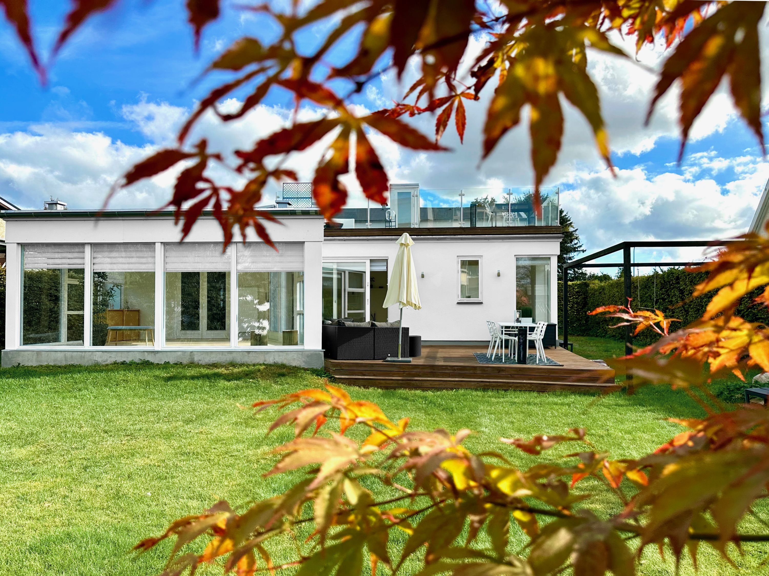 Her vil I elske at tilbringe solskinsdagene under åben himmel, og den store tagterrasse suppleres af en dejlig, nem og aflåst have med vestvendt træterrasse og flot beplantning, som bl.a. udmærker sig med ahorn- og kirsebærtræer. Bilen kan I holde i carporten, og til opbevaring er der et stort skur på 23 m2 samt et lille cykelskur.