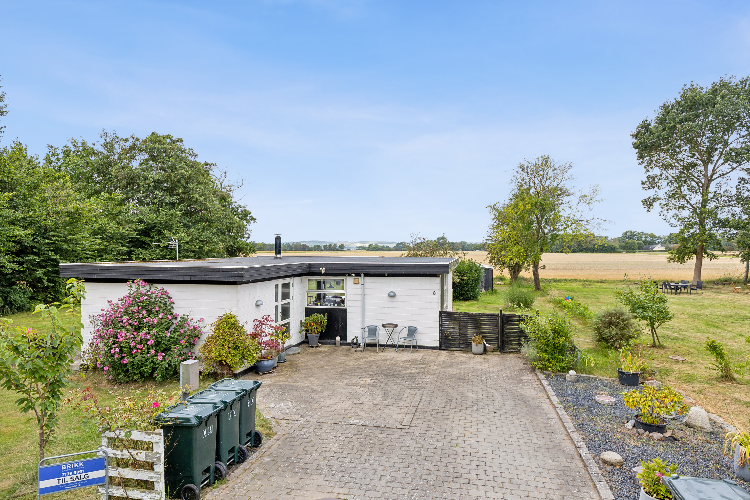 Fra stuen er der direkte adgang til husets største terrasse, som orienterer sig perfekt mod vest og indfanger dagens sene solstråler. Her kan I nyde aftenerne under åben himmel eller trække ind under det overdækkede parti, når vejret viser sig fra sin mere lunefulde side. Udearealerne byder på flere terrassemiljøer langs huset, så den første kaffe kan nydes i morgensolen fra øst, og herefter kan I rykke rundt i takt med lyset. Den 1.205 m2 store grund giver god plads til leg og udeliv med grøn plæne, frugttræer, buske og ikke mindst en vid udsigt over de åbne landskaber. Praktikken følger med med to udhuse.