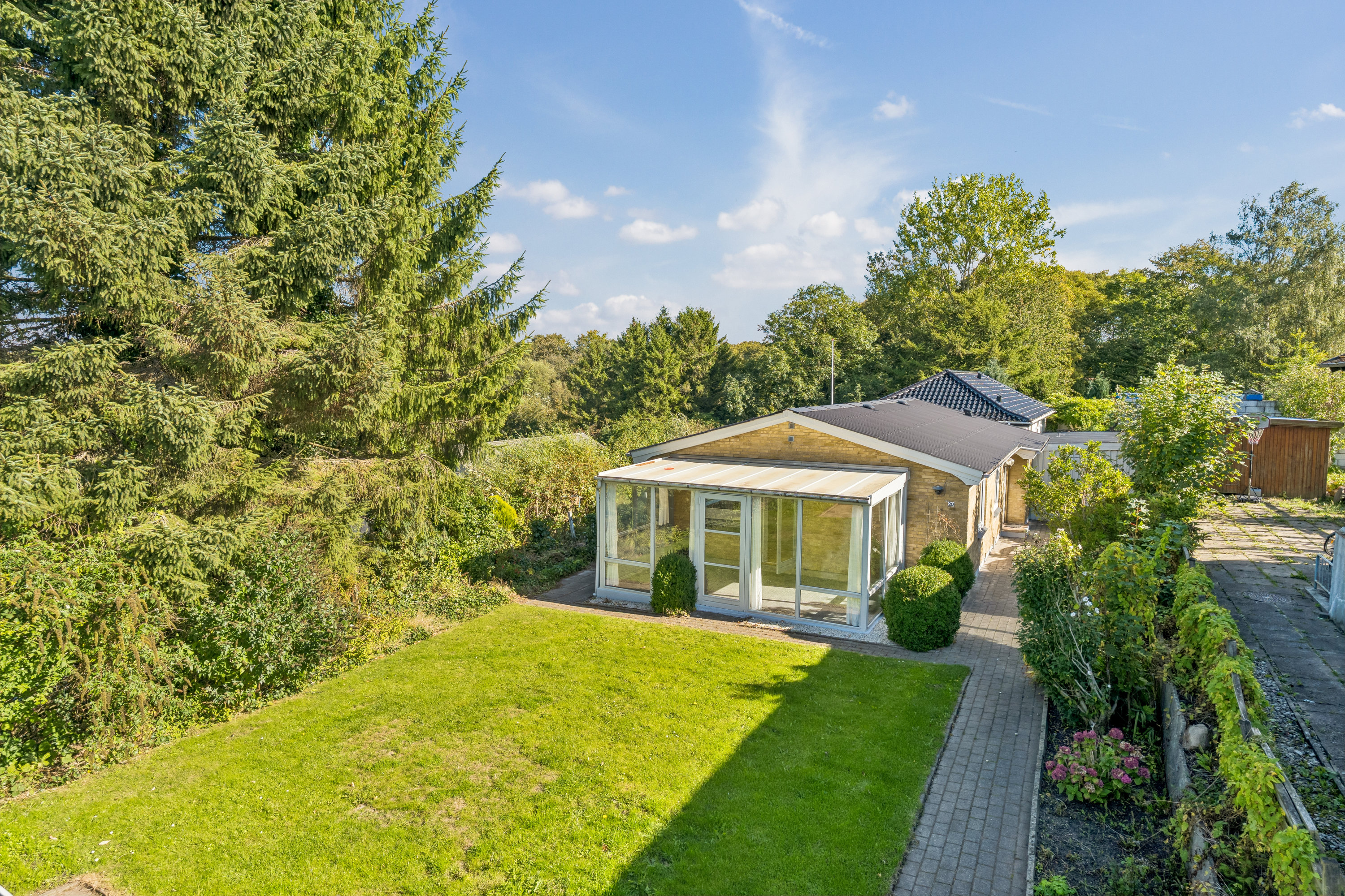 Udenfor får I fornøjelsen af en velanlagt have, der indbyder til rolige stunder i havemøblerne på den solrige terrasse, som fordelagtigt er orienteret mod vest og skøn udsigt mod nord. Haven byder på græsplæne, træer, buske og blomster, og dertil hører også en carport samt to skure, så der er god plads til opbevaring udenfor.