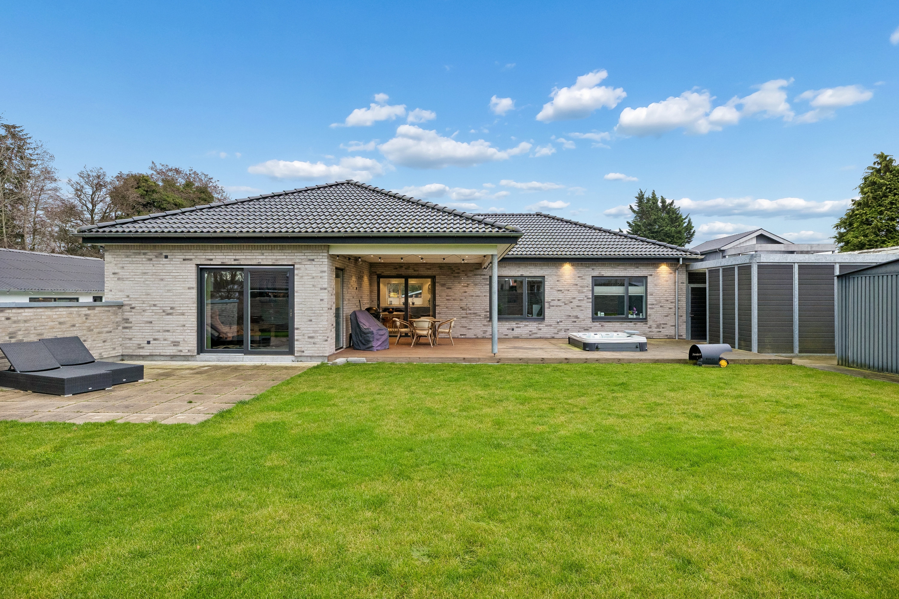 indbygget skur, og følger I fliserne rundt om huset, vil I hurtigt befinde jer i baghaven. Den byder på en nem græsplæne med masser af plads, og så rummer den et skur, så legesager og havemøbler nemt kan pakkes væk i vinterhalvåret. Langs huset er der anlagt en stor træterrasse som er delvist overdækket, der udover bydes der på en lille bid hverdagsluksus i form af et lækkert boblebad. Den store vestvendte træterrasse ligger perfekt i forhold til solen. Der er sol på terrassen fra lidt over middag til solen går ned. Der findes også en hvid flise belagt terrasse i forlængelse af stuen.