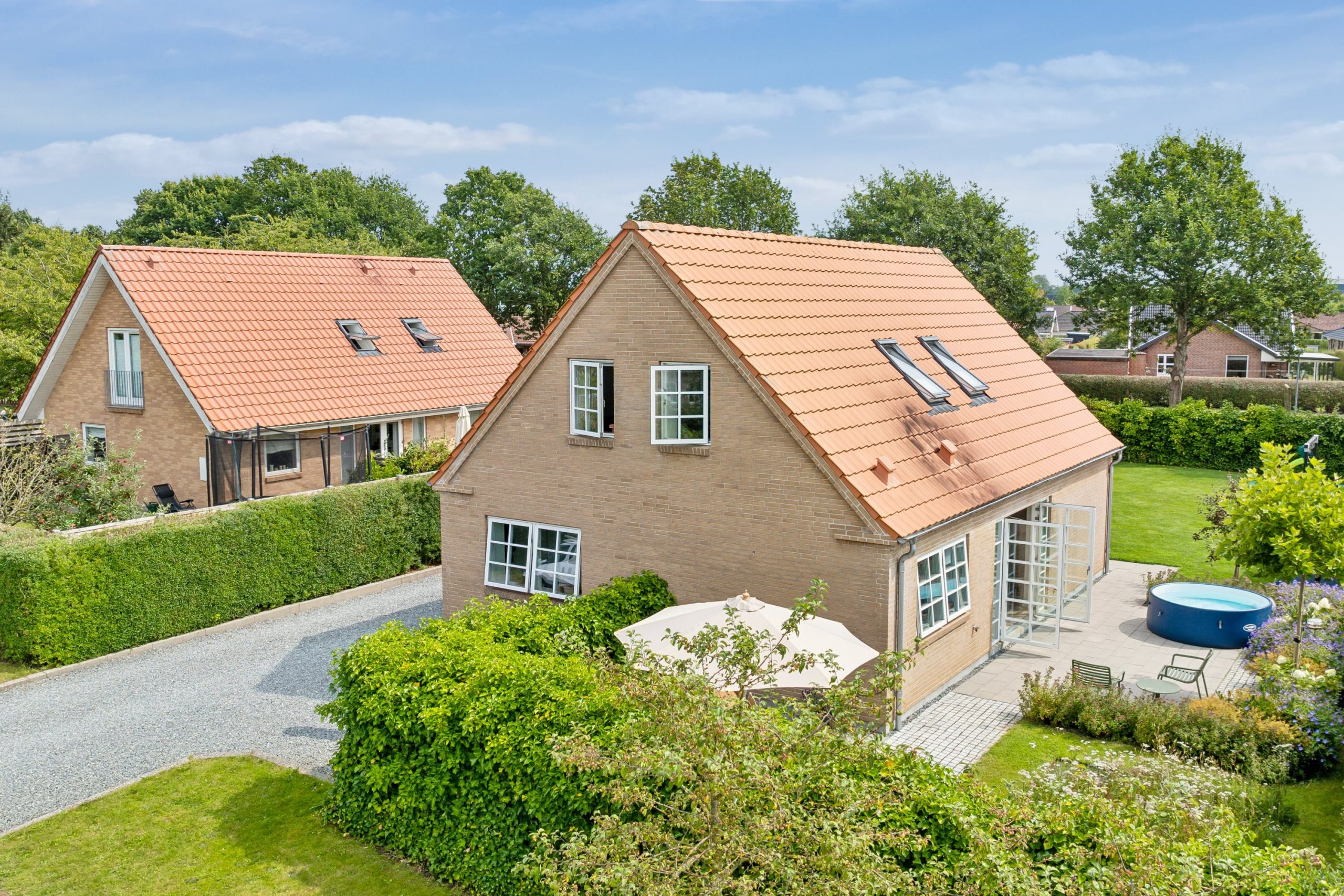 Huset blev opført i 2015, en toplansvilla med murede gavle, gesims, sprossevinduer og tegltag, der præsenterer sig flot, klassisk og indbydende. Foruden selve huset er der carport med oplader til elbil samt indgang til kontor, der opvarmes med varmepumpe, og det bedste af det hele: en skøn og overskuelig have. Haven kan bl.a. nydes fra en af de 3 hyggelige terrasser og der er plads til havespil og leg.
