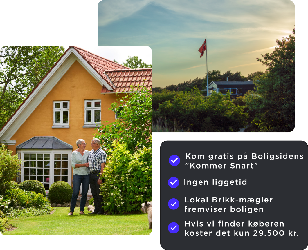 Start dit boligsalg stille, sikkert og helt gratis med Brikks Superskuffe. Brikk viser din bolig anonymt og uden liggetid, så du kan teste markedets interesse i ro og mag. Din bolig kommer på Boligsiden som en bolig der snart kommer til salg. Boligen trækker derfor ikke liggetid. Udover Boligsiden så bliver din bolig eksponeret for alle købere i Brikk store nationale køberkartotek. Og ønsker du endnu større synlighed på dit skuffesalg før boligen kommer på Boligsiden som en "normal" bolig til salg, kan du tilkøbe målrettet markedsføring på sociale medier for at nå endnu flere potentielle købere.